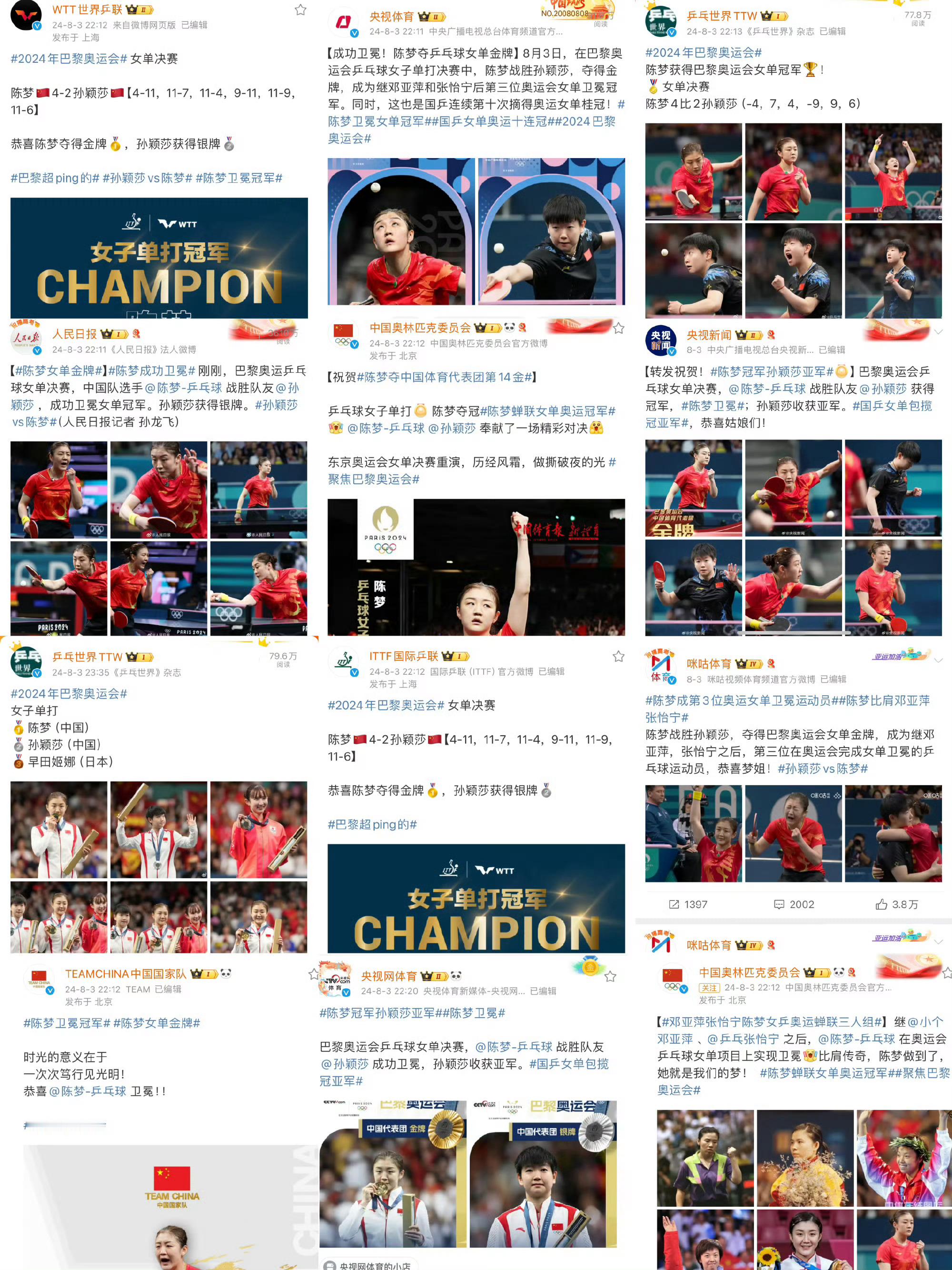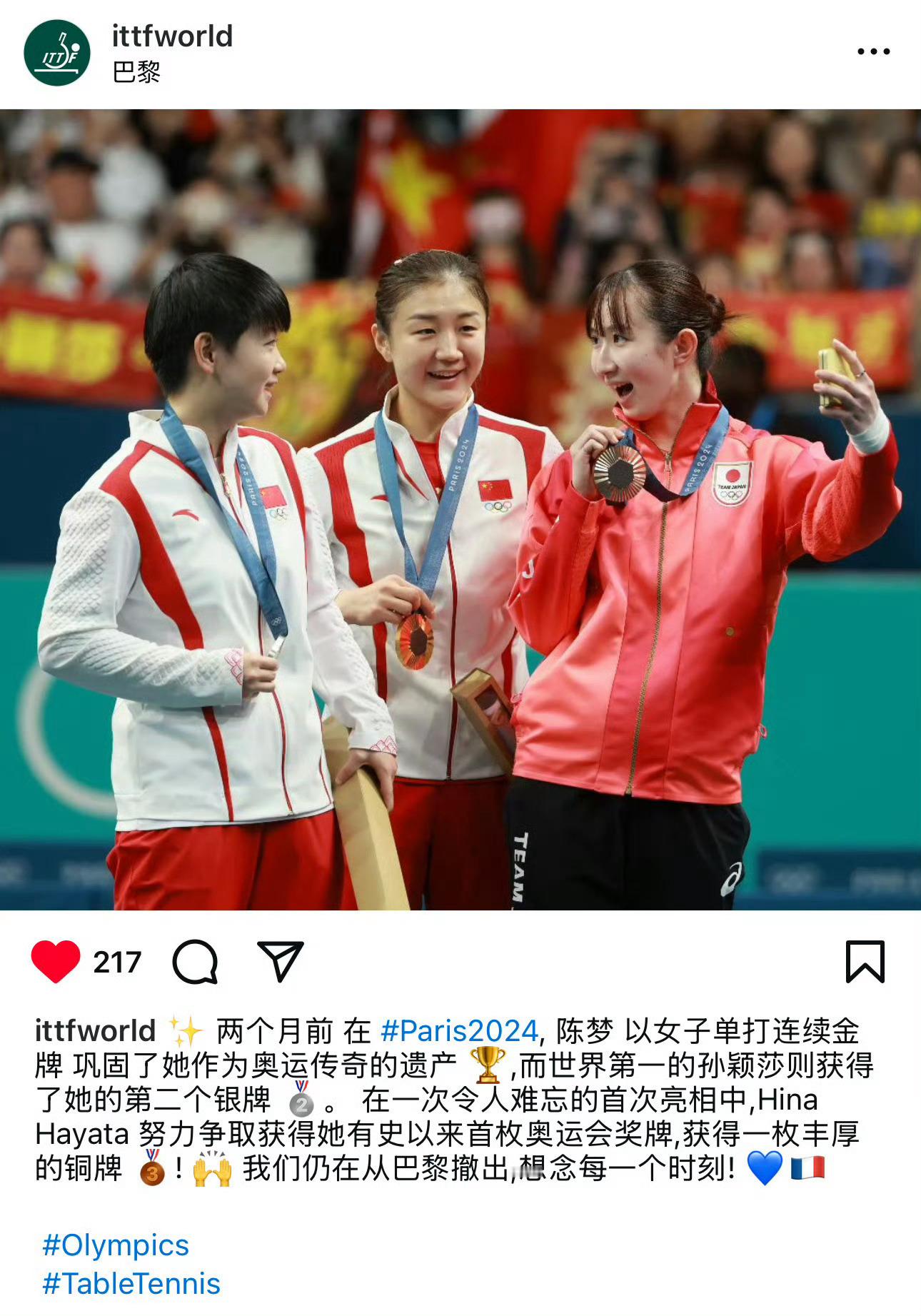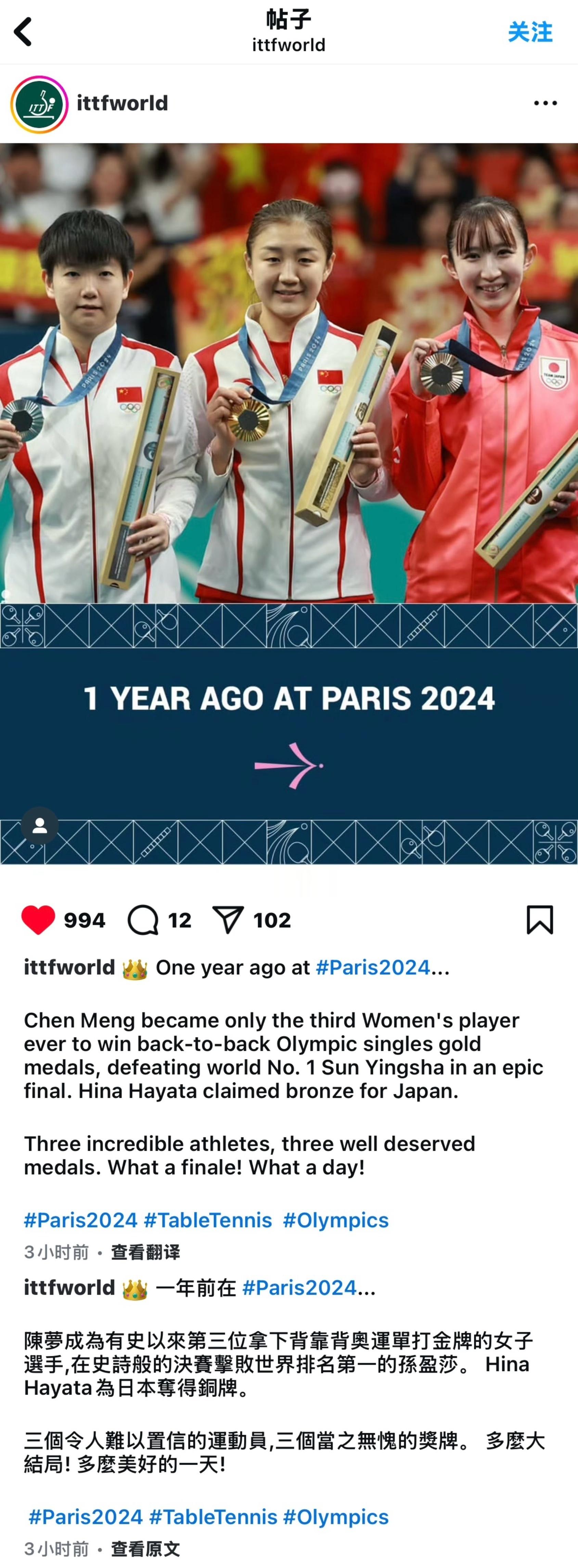 图3️⃣:20250803 ITTF国际乒联发贴:一年前在 巴黎2024…陈梦成为史上第三位连续夺得奥运女单金牌的选手,在史诗般的决赛中击败了世界排名第一的孙颖莎,日籍选手早田希娜为日本赢得了铜牌。
