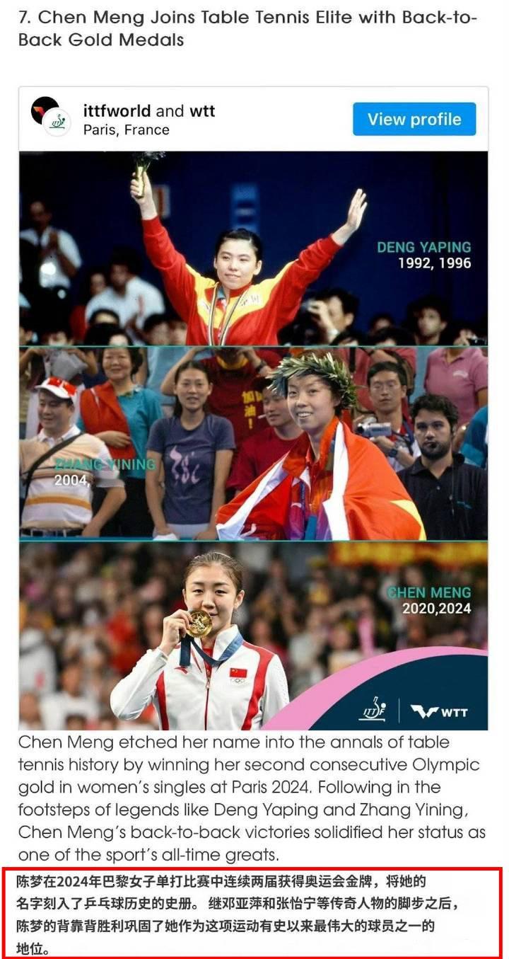 图4️⃣:国际乒联(ITTF)回顾奥运会冠军陈梦的精彩成就,文中写道:陈梦在女子乒乓球领域的巅峰崛起,展现了罕见的精湛技术与竞技才华的完美结合。她在东京奥运和巴黎奥运上蝉联奥运会单打金牌,成为继邓亚萍和张怡宁之后又一位实现这一非凡成就的精英选手。