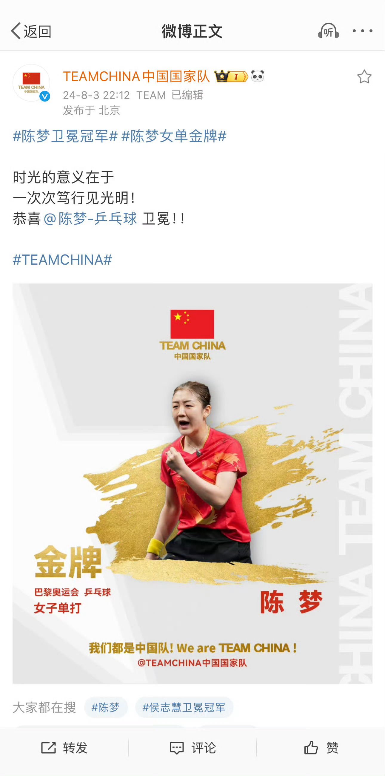 Chen Meng cemented her legacy as an Olympic legend with back-to-back golds in Women's Singles🥇 两个月前:在2024巴奥,陈梦以女子单打连续金牌🥇,巩固了她作为奥运会传奇遗产🏆