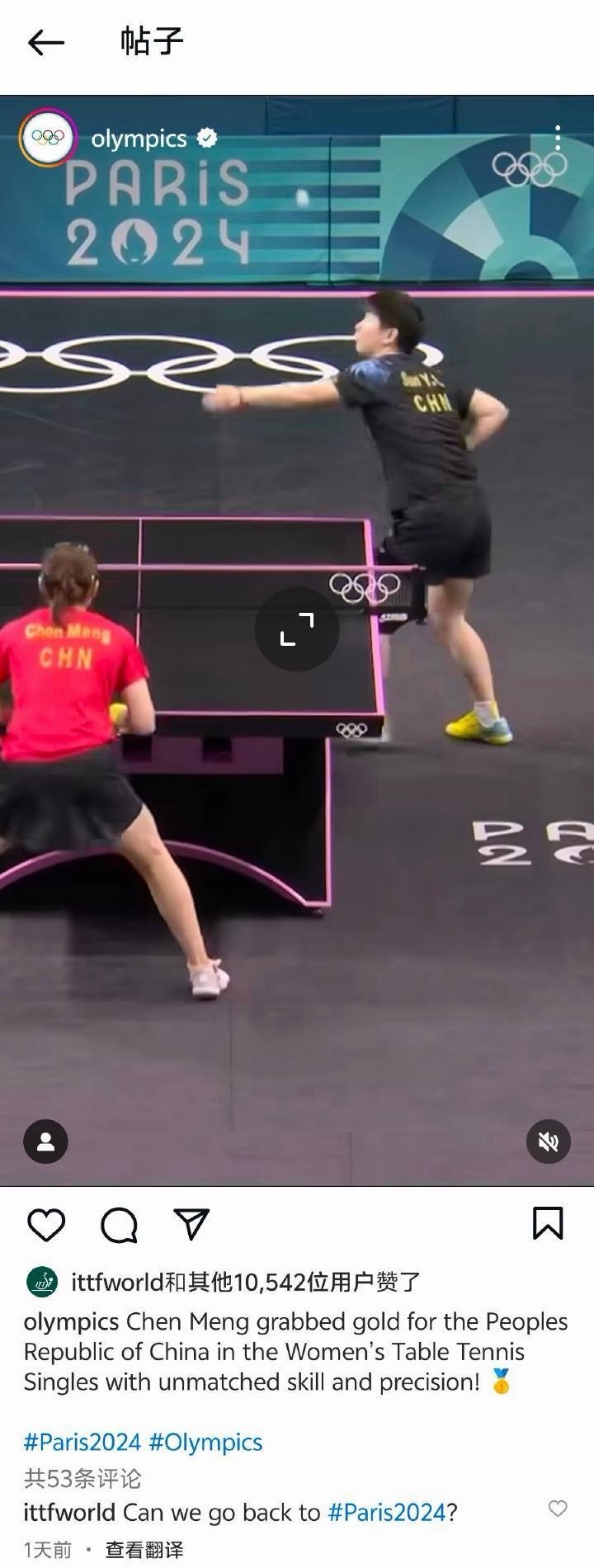 图1️⃣:ITTF/WTT官方发帖:陈梦在2024 年巴黎奥运会乒乓球女子单打比賽中连续两届获得金牌,将她的名字刻入了乒乓球历史的史册。