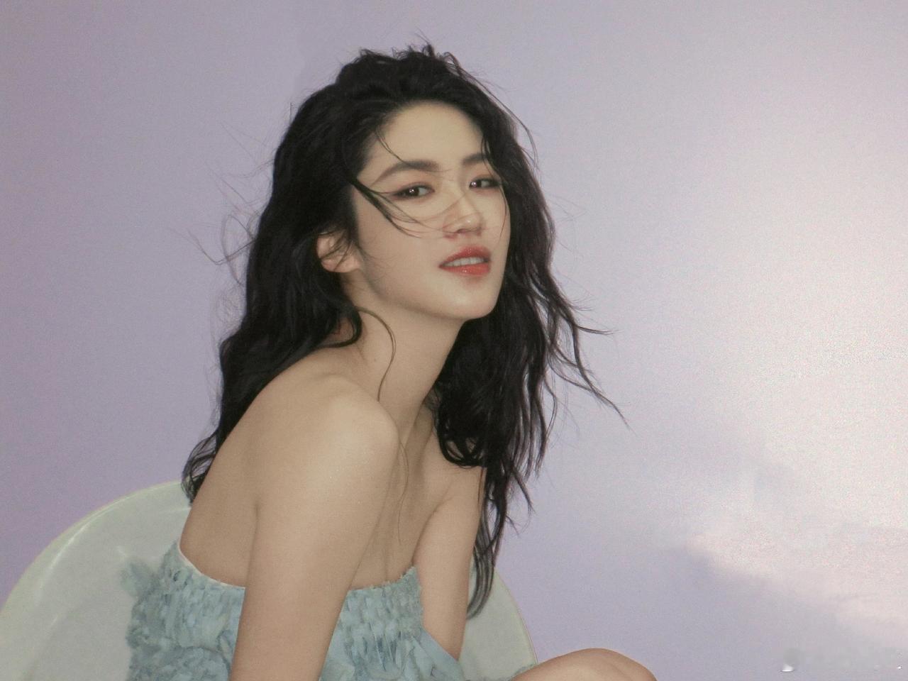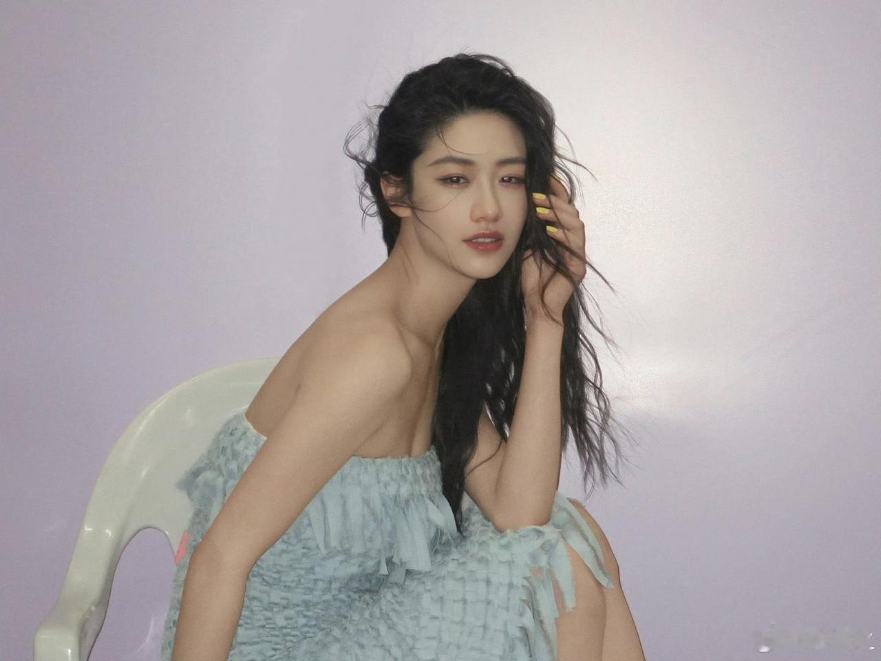 涵之的蓝色流苏抹胸裙和黄色美甲色彩清新,湿发造型慵懒随性,搭配海滩与紫色背景,完