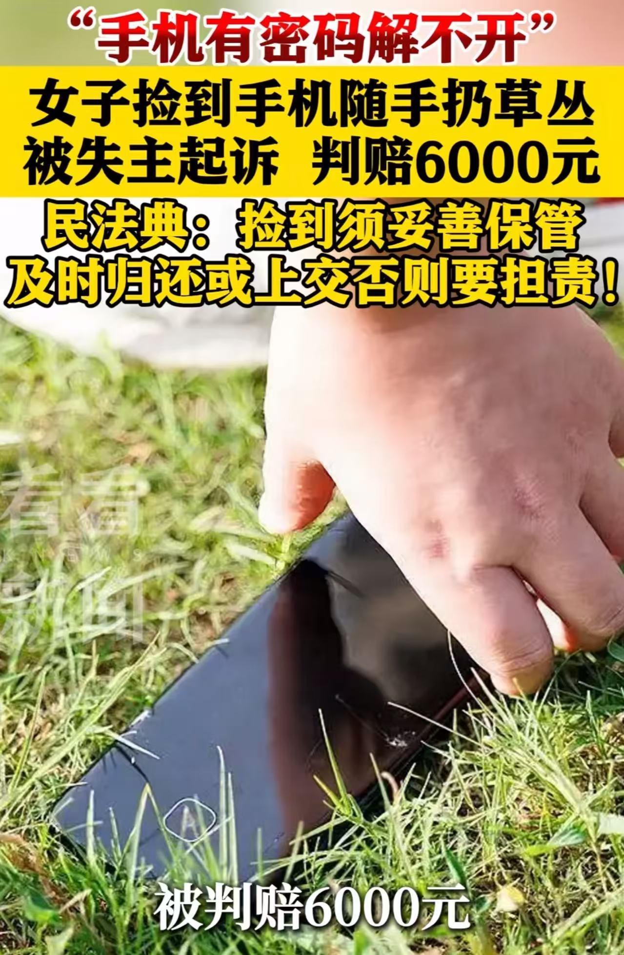 河南郑州,女子捡到手机解不开密码丢掉,被判赔6000 元!网友:以前是人不能扶,现在是手机也不能随便捡了?