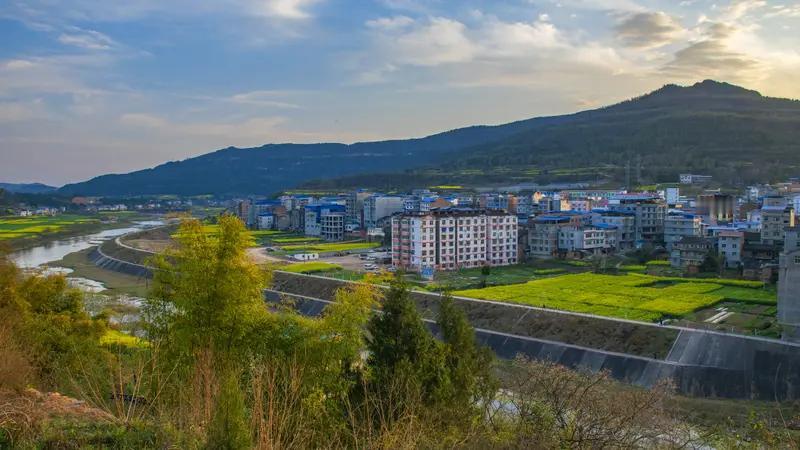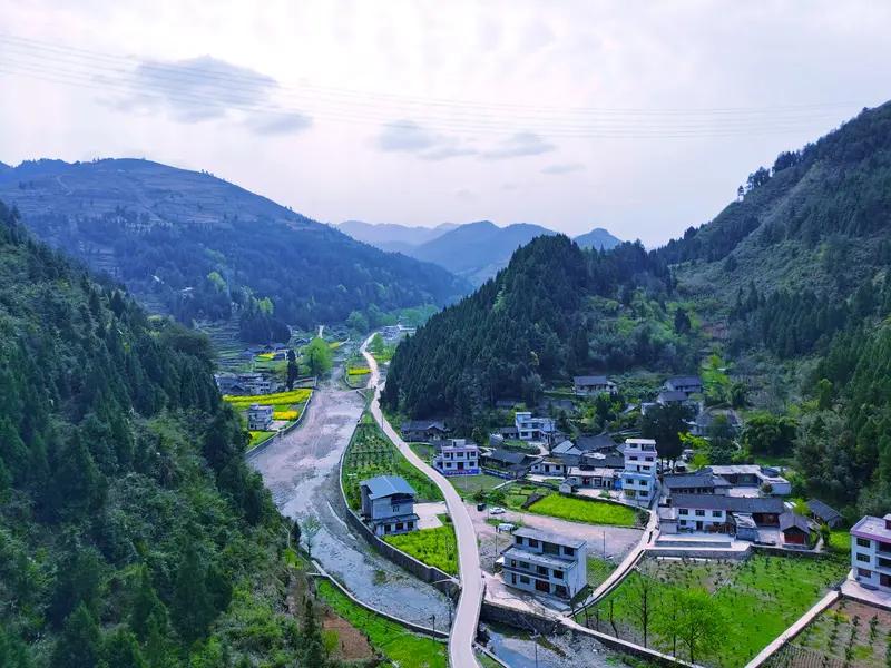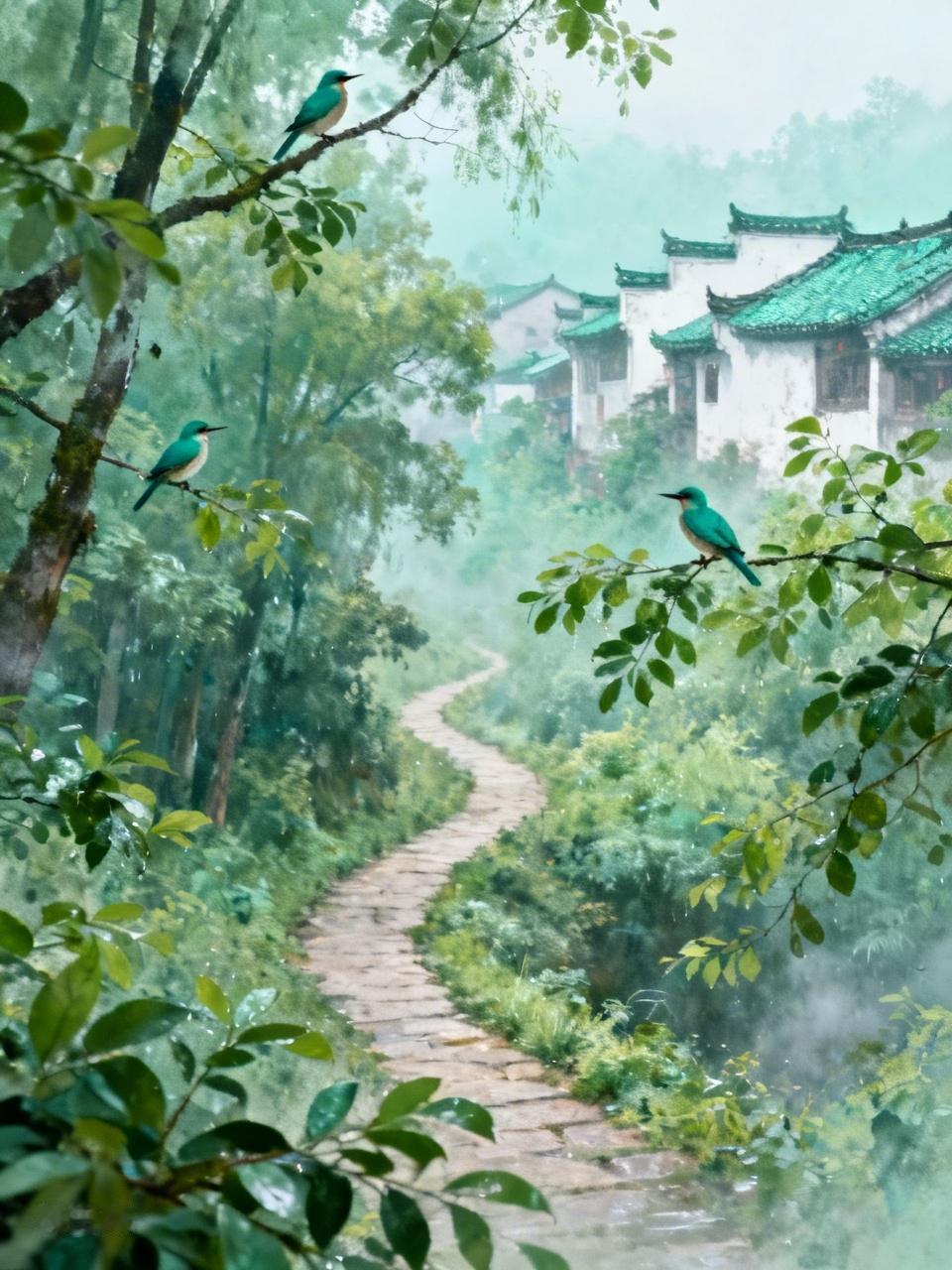 游城固县南部山区古镇二里坝 林密径幽花斗妍, 翠鸟啼枝韵音甜。 纵目峰头云缥缈,