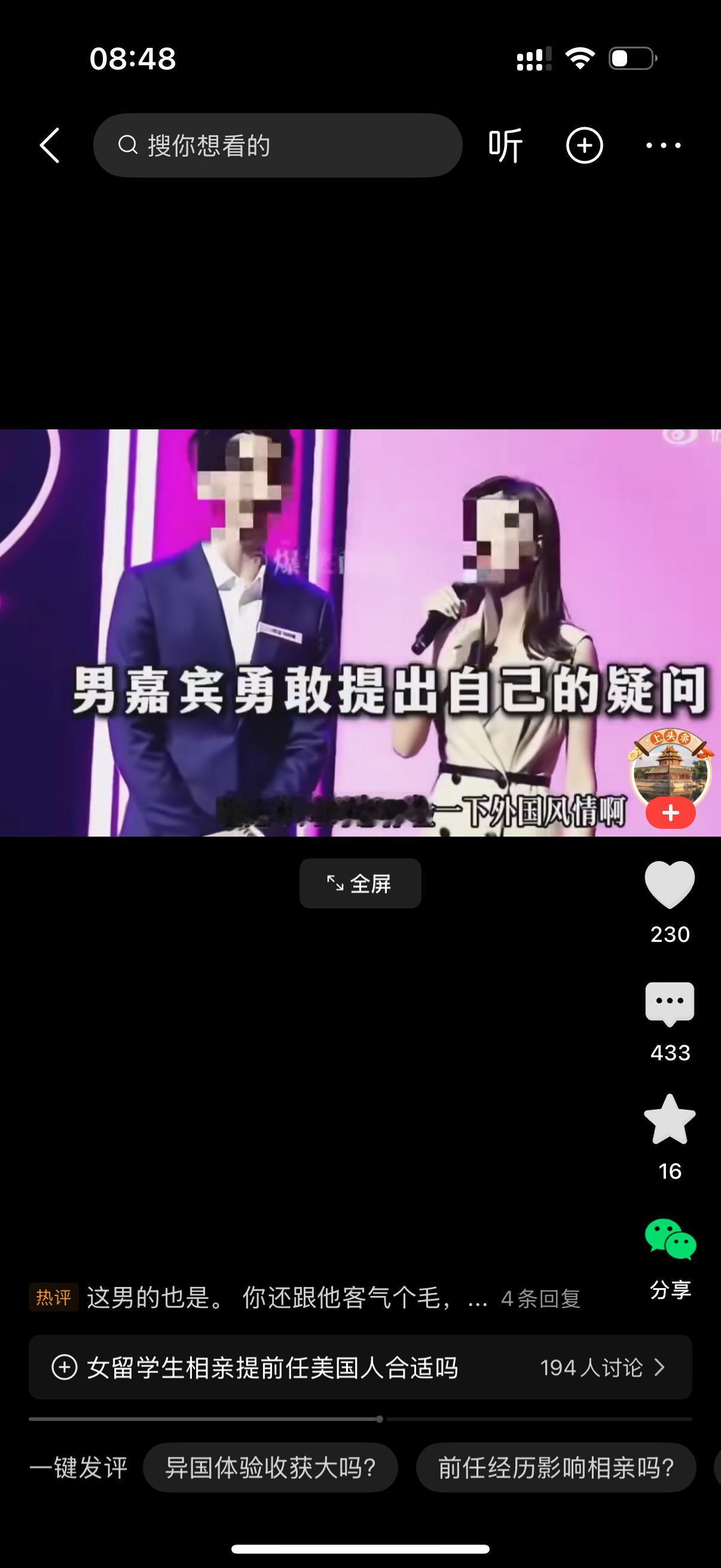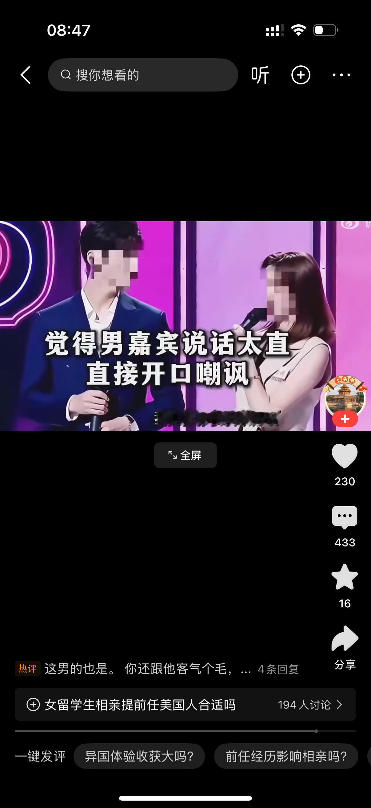 留学回国的美女说自己曾经的几位男朋友都是纯正的美国人,自己也差一点成为美利坚的公民。不过在外面转了一圈之后,我还是发现祖国最好。男子问她,你出国留学是真正地想嫁到外面去,还是单纯想体验一下外国风情啊?美女感觉受到了冒犯,回怼男子,喜欢体验异域他乡的,是你们男人居多吧?你真的很没有教养哎。男子脸都绿了。