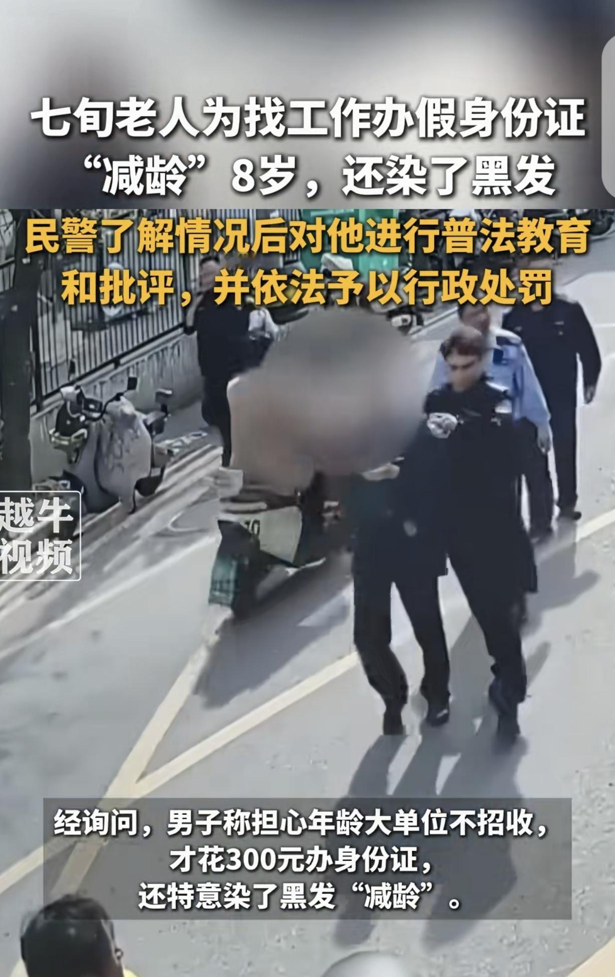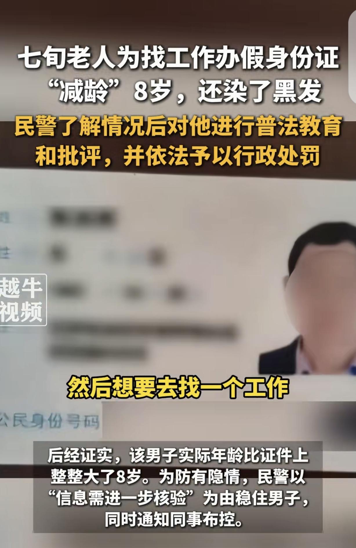 “人老了太可怜了!”江苏,一70多岁大爷,想出去打工,怕没人用他,竟花300块钱办了假身份证,减龄8岁,还染了黑发,可去派出所办户籍证明时被识破,真相让人心酸。