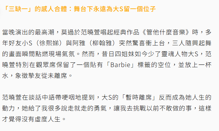 【范晓萱演唱会给大S保留座位】歌手范晓萱于 25 日晚间举行演唱会。当晚演出的最高潮,莫过于范晓萱唱起经典作品《管他什么音乐》时,多年好友小S(徐熙娣)与阿雅(柳翰雅)突然惊喜冲上台,三人随兴起舞的画面瞬间点燃现场气氛。范晓萱特别在观众席保留了一个贴有“Barbie”标签的空位,并放上一杯水,象征挚友大S从未离席。范晓萱在谈话中语带哽咽地提到,大S的“暂时离席”反而成为她人生的动力,“她给了我很多说走就走的勇气,让我去挑战以前不敢做的事,这样才觉得没有虚度人生。”(联合报)