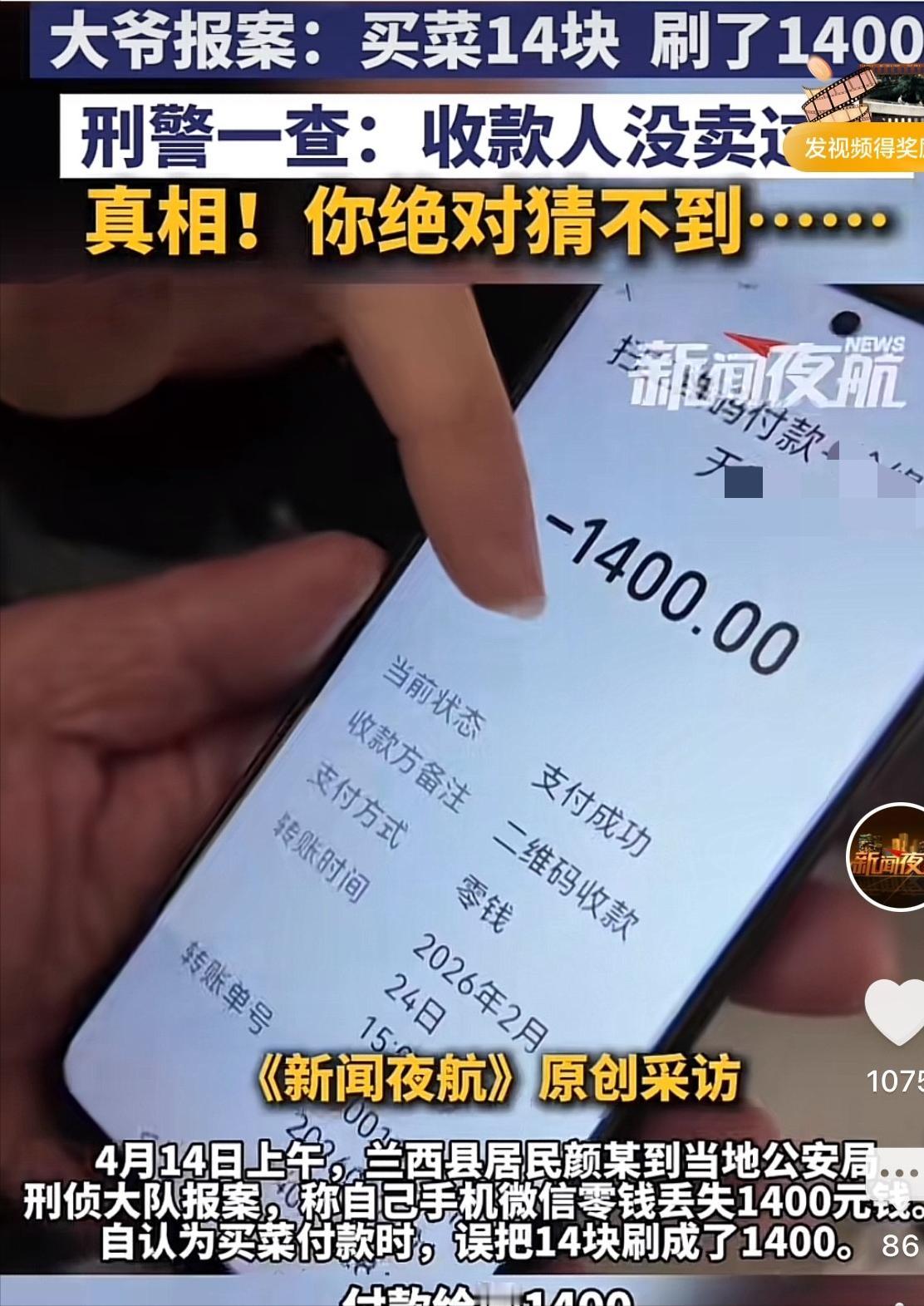 有赌的成分!黑龙江兰西,一大爷报案称,自己买菜花了14元,误扫了1400元。民警