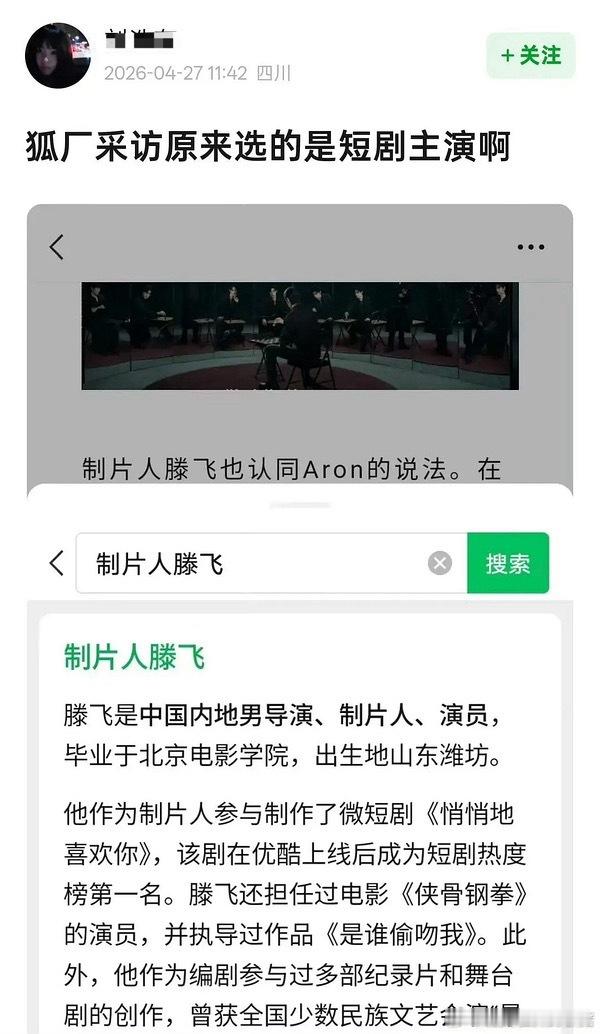 搜狐的这篇看似爆料内娱一些男明星,其实有人买来吹自己的软文…狐厂这篇软文的业内,网友扒出了原来还是短剧主演,看来有人急需短剧业内认可 信他还不如信汪海林呢,那是真业内
