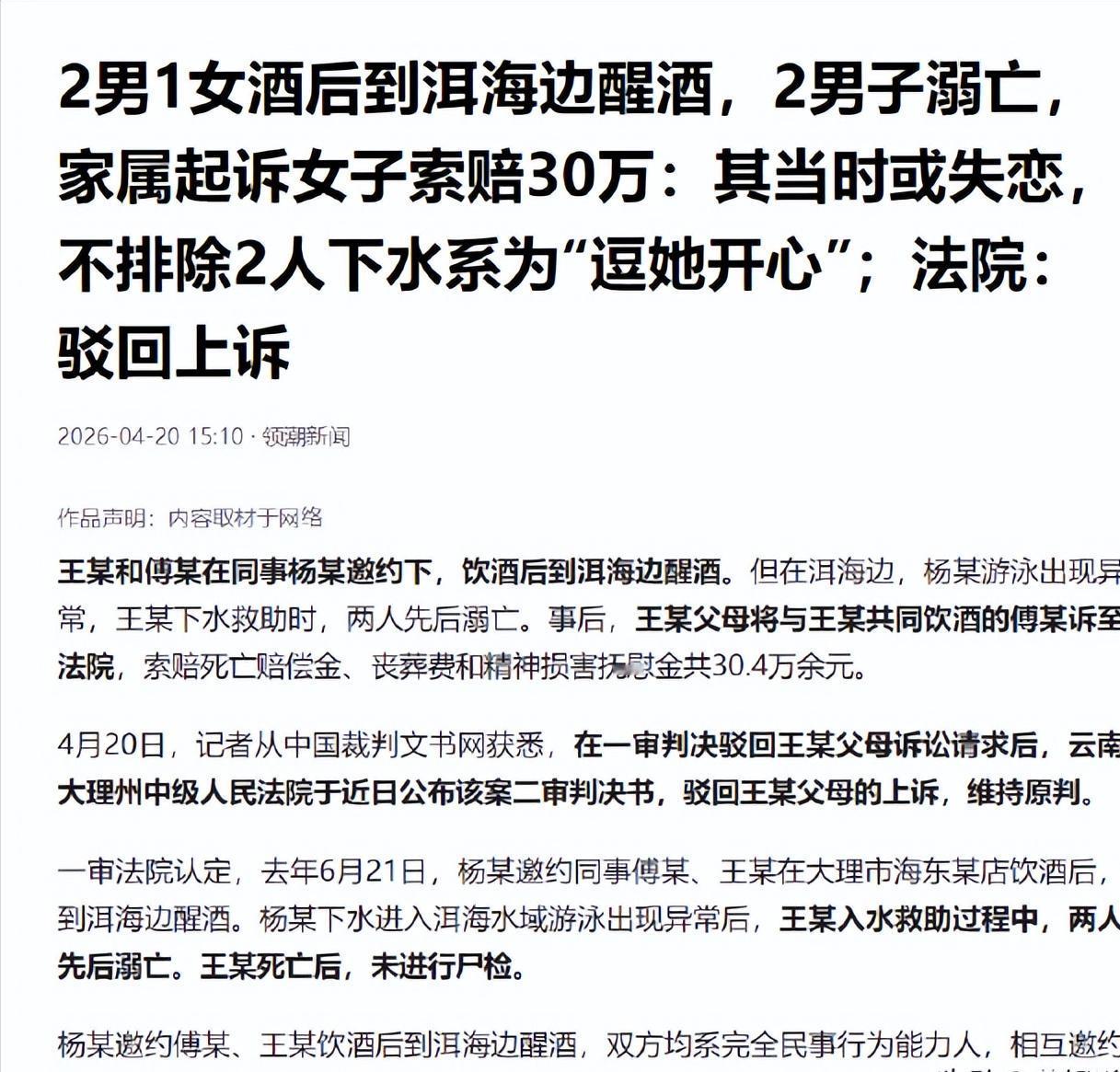 酒桌上,傅某边喝边哭,两个男人全程陪着,倒酒、听她诉苦。散席之后,众人前往洱海醒酒。此时,杨某突发奇想,提议下水游泳,其目的竟是为了“逗她笑”,试图以这般举动博佳人嫣然一笑。他自己跳了,王某看他出事也跳了。