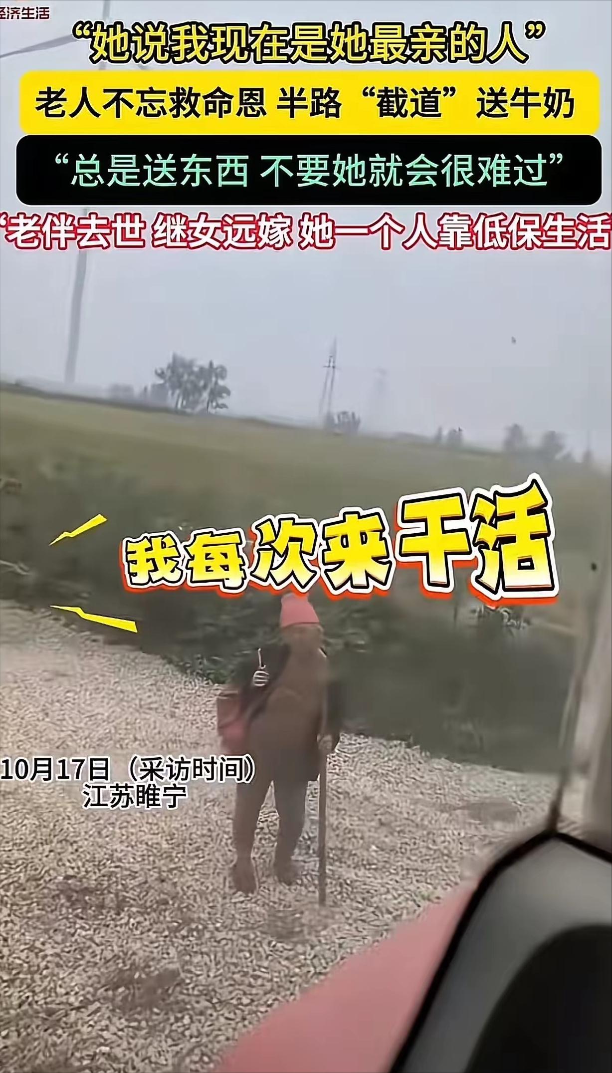老伴去世,继女远嫁,老人一个人靠低保生活,却从农用三轮车上摔下,没钱治疗,邻居给他穿上寿衣等死,而村里一个开农机的男子知道后,发动身边的人捐钱,救了老人的命。现在男子干活,老人总是给他送吃的喝的,不要她就会很难过!