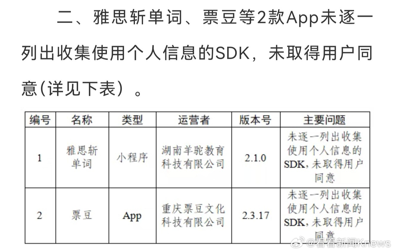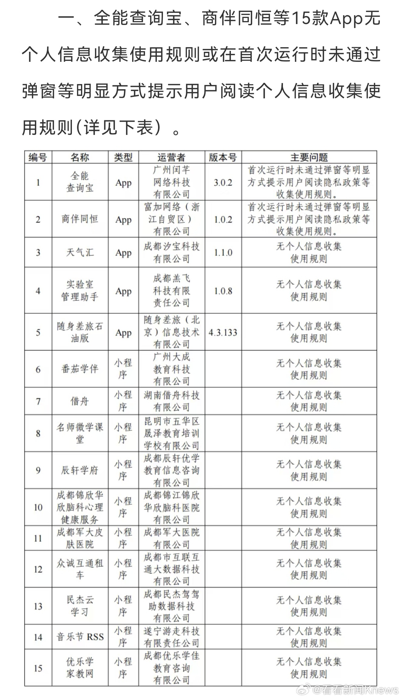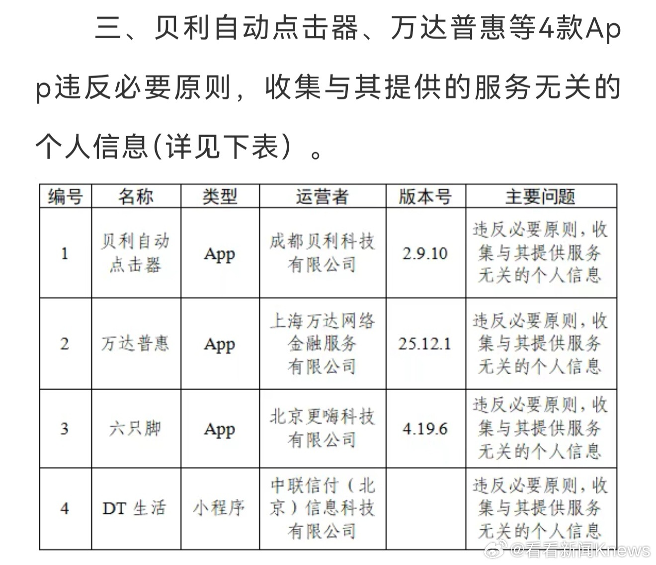 【关于33款App个人信息收集使用问题的通报】#33款App被通报违规收集个人信息# 根据中央网信办、工业和信息化部、公安部联合发布的《关于开展2026年个人信息保护系列专项行动的公告》,依据《网络安全法》《个人信息保护法》《网络数据安全管理条例》《App违法违规收集使用个人信息行为认定方法》等法律法规和有关规定,中央网信办组织对App(含小程序)收集使用个人信息行为进行检测,现对有关问题予以通报,详戳↓(新华社)