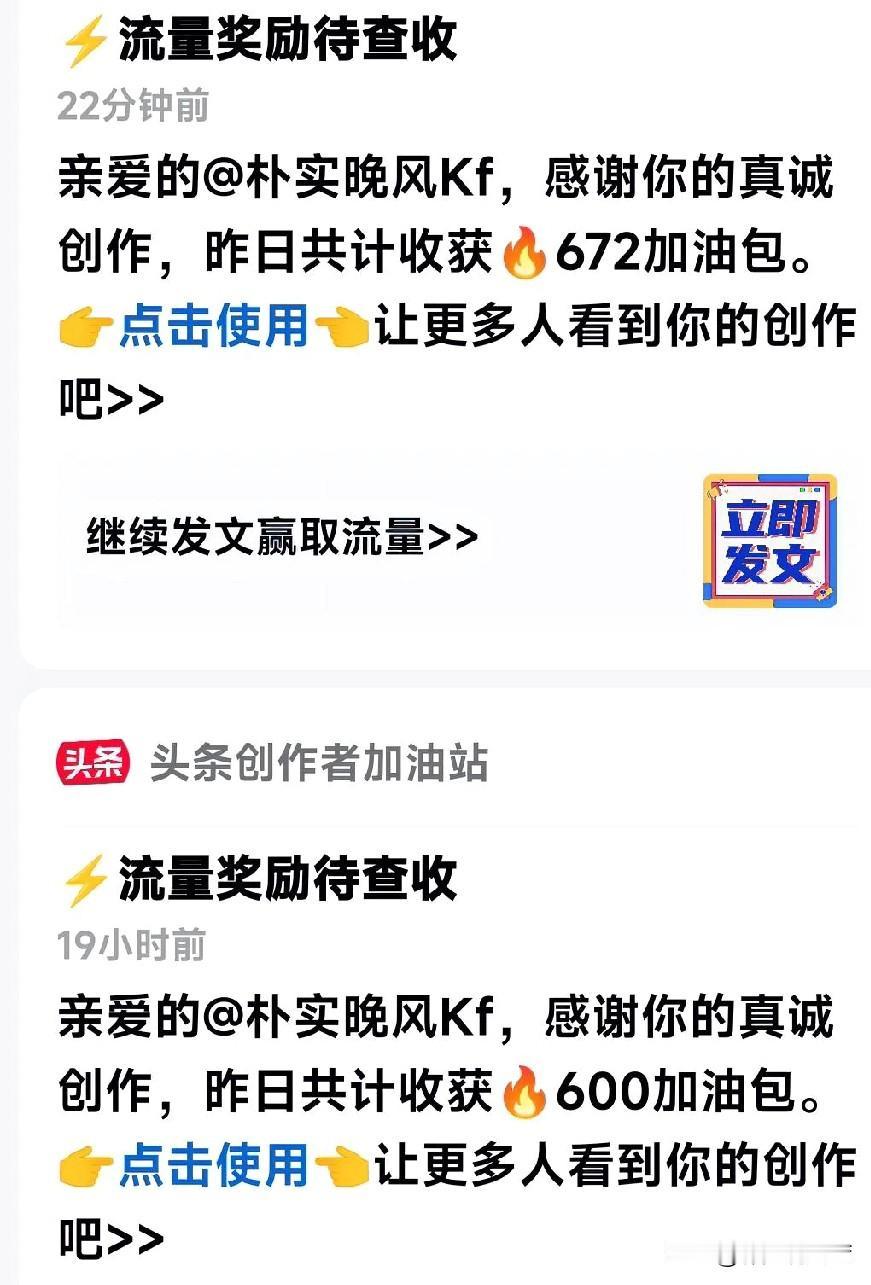 头条创作者加油站连续5天给我发加油包,最低400,今天672加油包。近期一段时间,展现量和阅读量都很低,每天的阅读量不足千个,不知是什么原因?我也懒得去管它,平台给我加油包,是给我鼓劲儿,继续写我的头条,