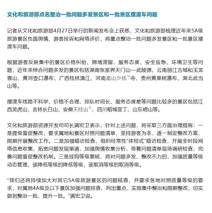 五一长假来临前夕,文旅部点名通报了一批景区,主要是问题多发的景区摆渡车管理问题。这些被点名的景区,都是国内旅游打卡的超级网红景区,比如像天门山、丽江古城、玉龙雪山、黄河壶口瀑布、嵩山少林寺、黄果树瀑布、湖北武当山等。
