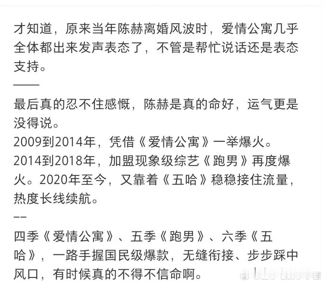 看到有人翻出陈赫当年的离婚风波,《爱情公寓》全员几乎都发声力挺过,也难怪大家会感慨一句,陈赫确实命挺好的。