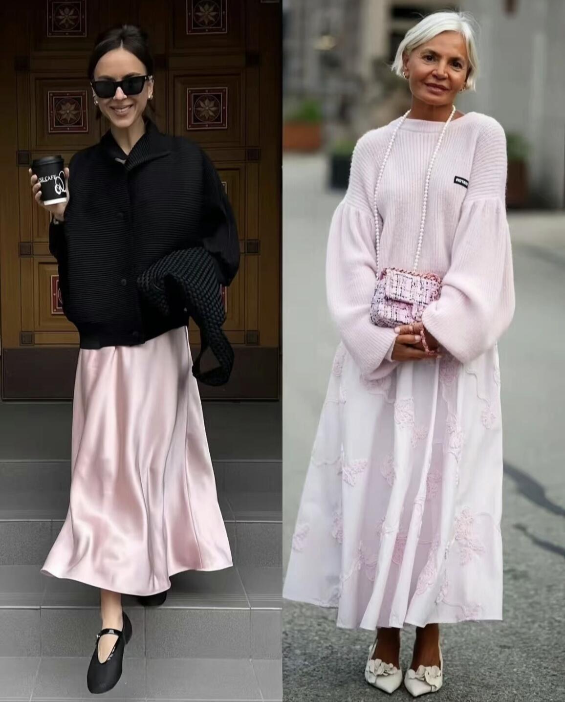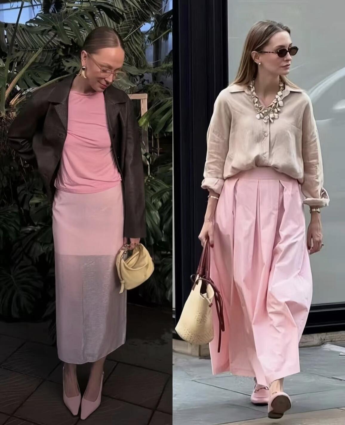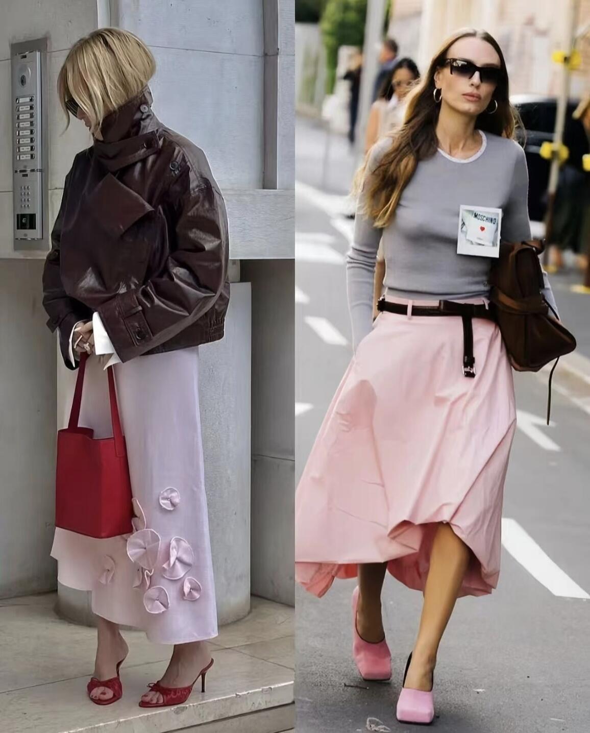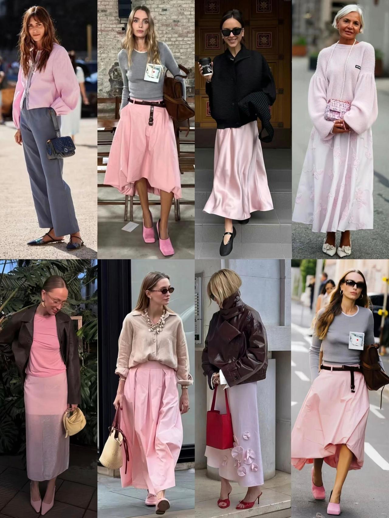 粉色裙子比想象中更好看呀! 柔和的樱花粉半裙/长裙,搭配灰调上衣、深色外套,用中性色中和甜腻,复古又温柔。无论是搭配乐福鞋、尖头鞋还是红调包包,都能轻松平衡风格,通勤、约会都适配,不挑年龄还自带好气色,温柔又有气场。 ^
