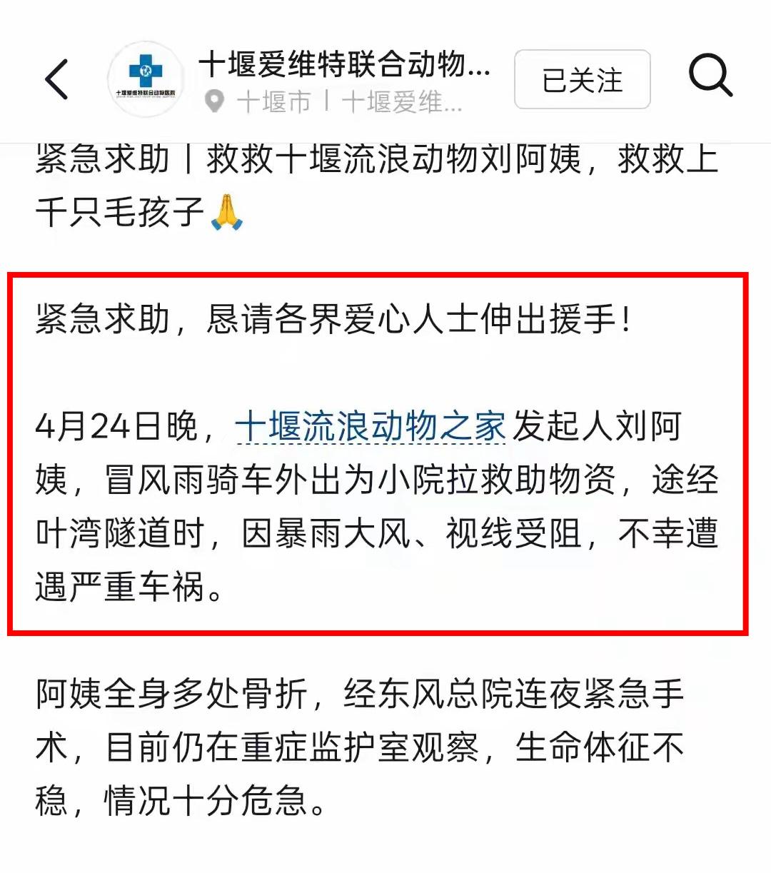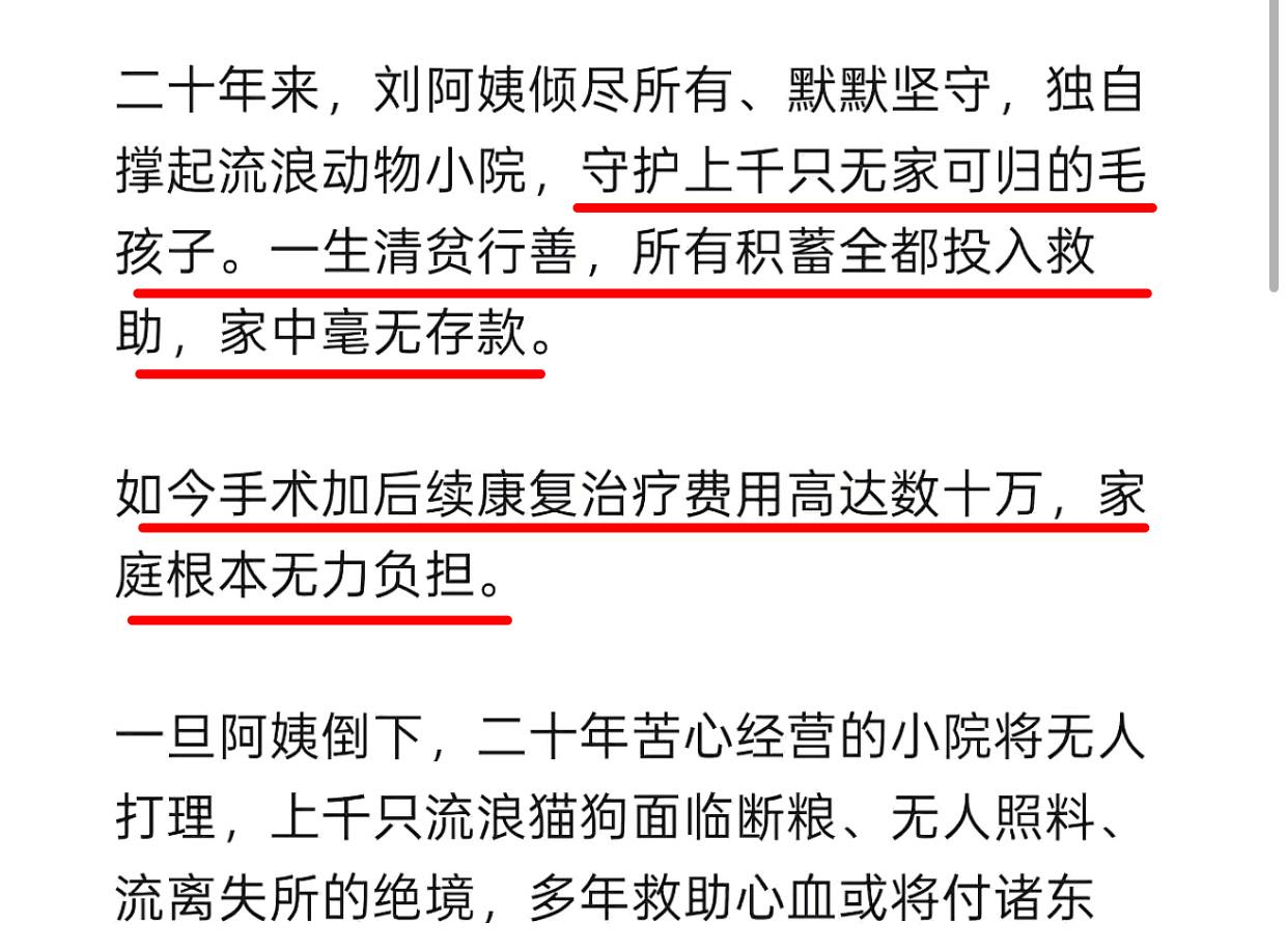 湖北70岁刘阿姨暴雨天骑三轮追尾前车进ICU,没钱治病后宠物医院发公告求募捐,背后的真相让动保人士和普通人瞬间沉默:二十年零存款(全用来喂养流浪猫狗)、恶劣天气出门是为了拉救助物资、上千只流浪动物月食物支出三万、一年开销近四十万的救助站长连治病的钱都没有,那些喊着支持保护流浪动物的人这个时候反倒鸦雀无声,更扎心的是公告的后面还在担心那些动物,这个时候人才应该是唯一重点。