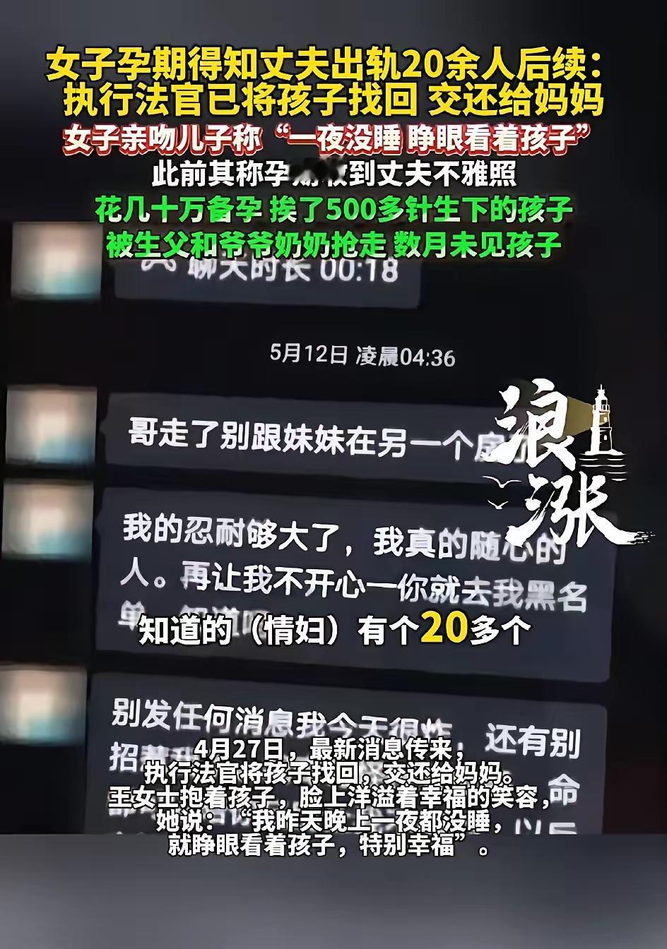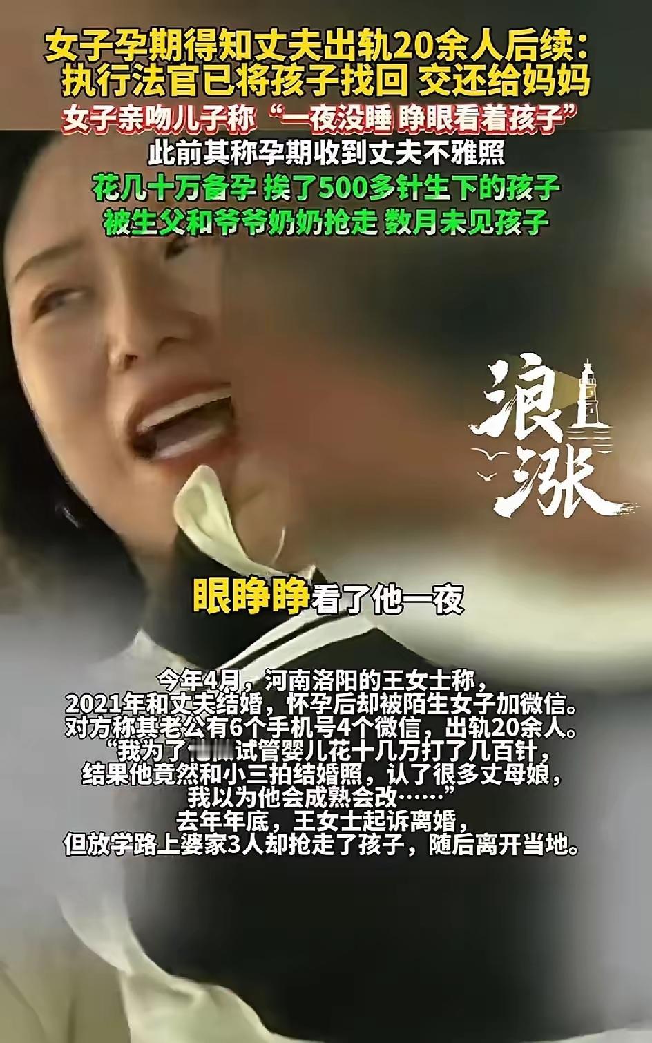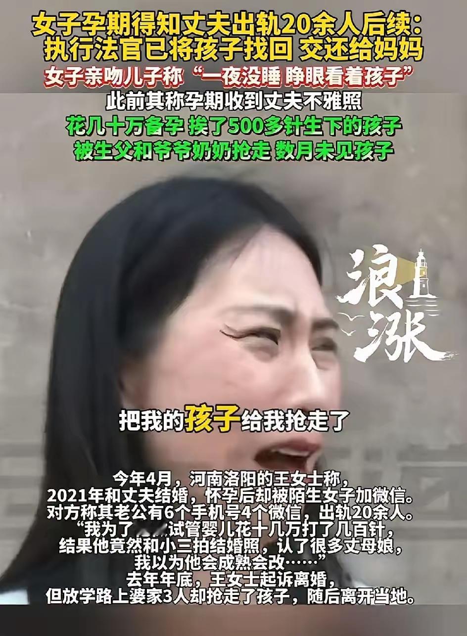 河南洛阳的王女士,花十几万打500多针做试管,孕期竟发现丈夫出轨20余人,还被陌生女子发来不雅照。后来离婚了。离婚后,孩子归王女士。谁知道孩却被丈夫他们抢走了。天啊, 历经千辛万苦生下来,说抢走都抢走。真是可恨至极,不要脸。