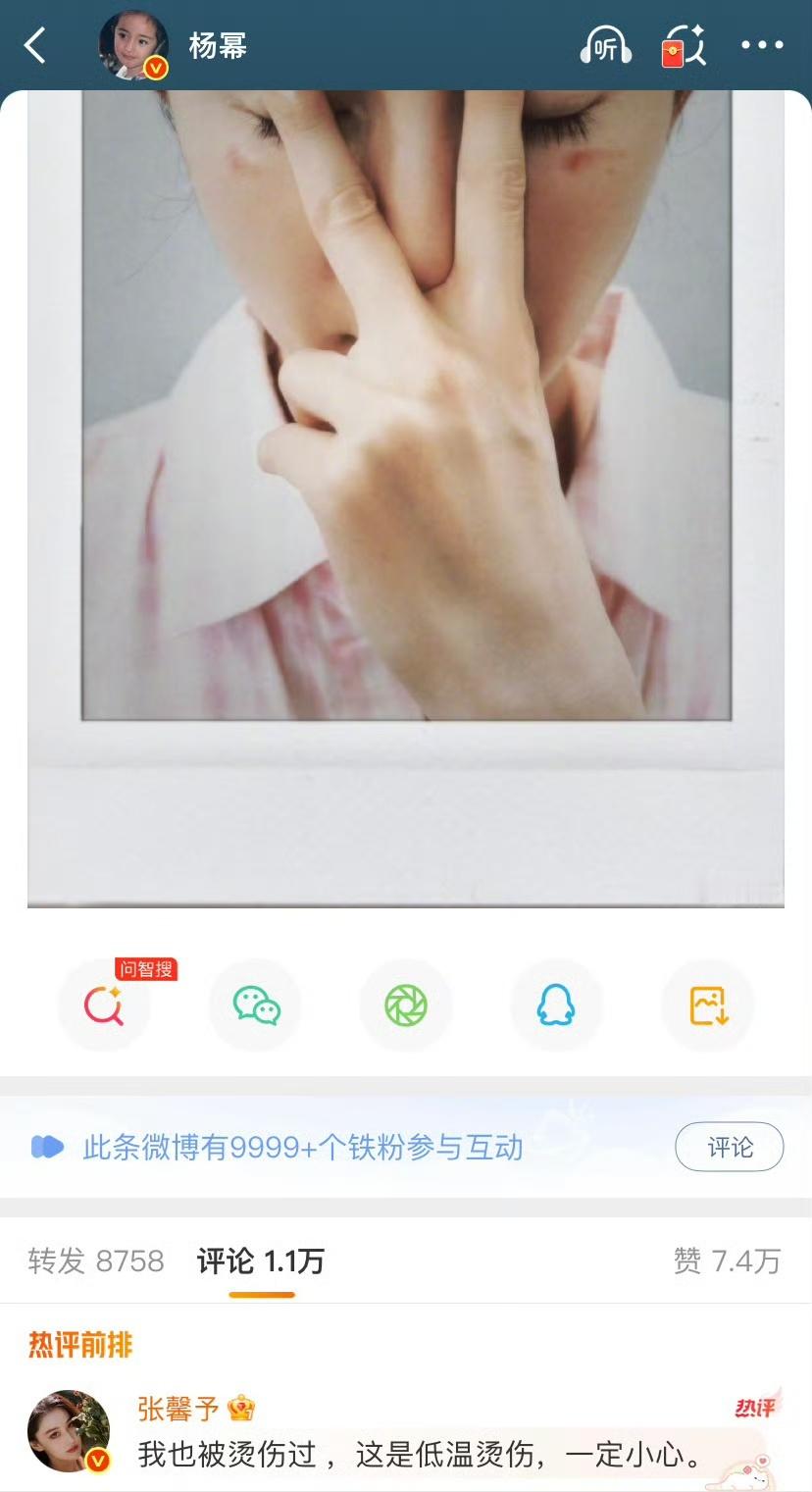 4月27日,杨幂晒图称遭蒸汽眼罩低温烫伤,眼下有两道明显红印,张馨予随后留言,坦言自己也曾被蒸汽眼罩低温烫伤,并提醒广大网友,警惕发热类眼罩的安全隐患。杨幂脸被蒸汽眼罩烫伤了张馨予也被蒸汽眼罩烫伤过