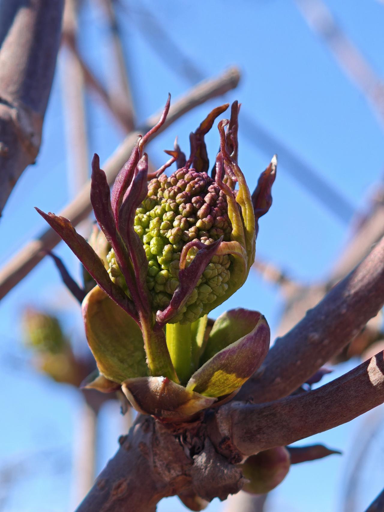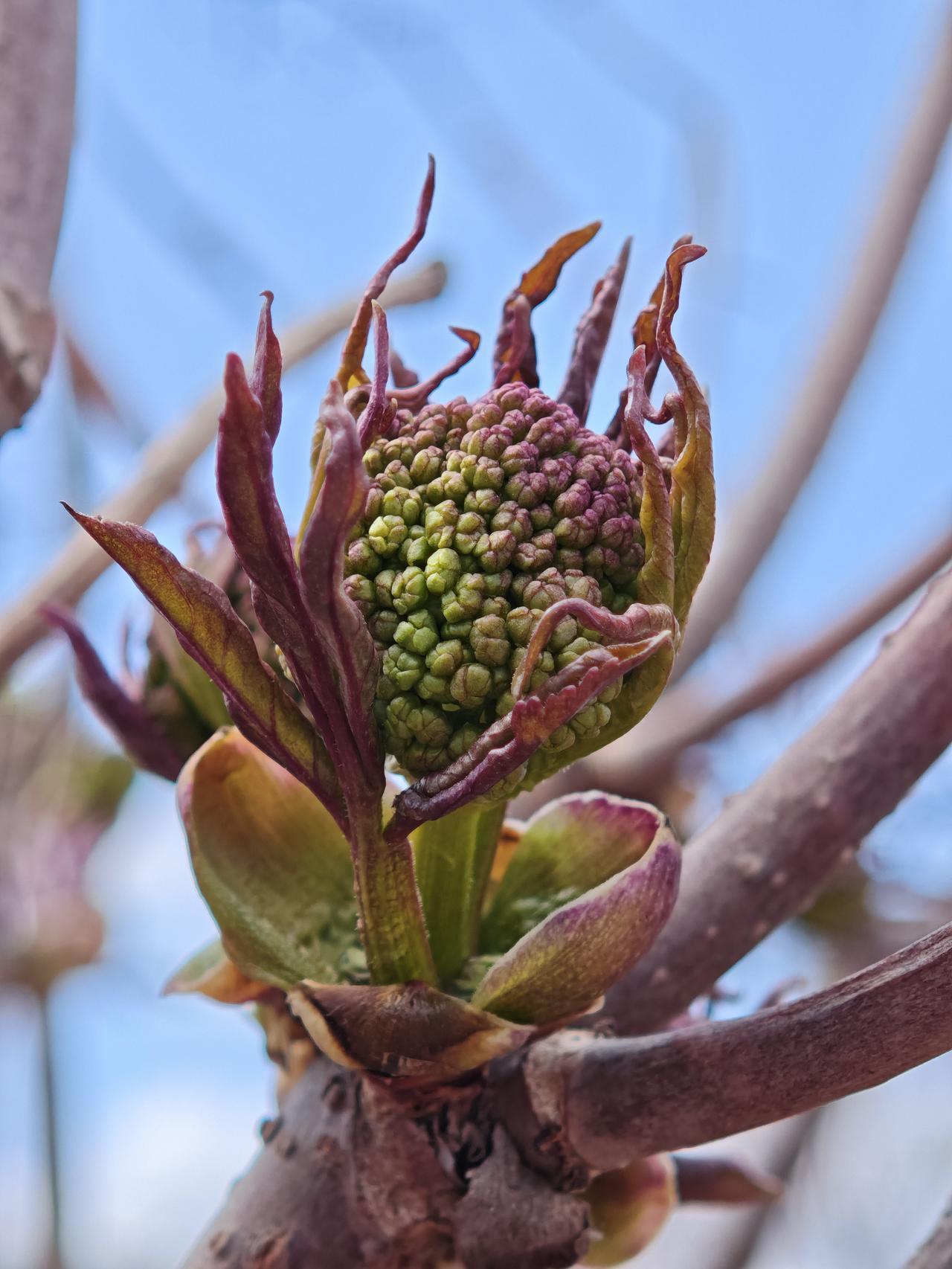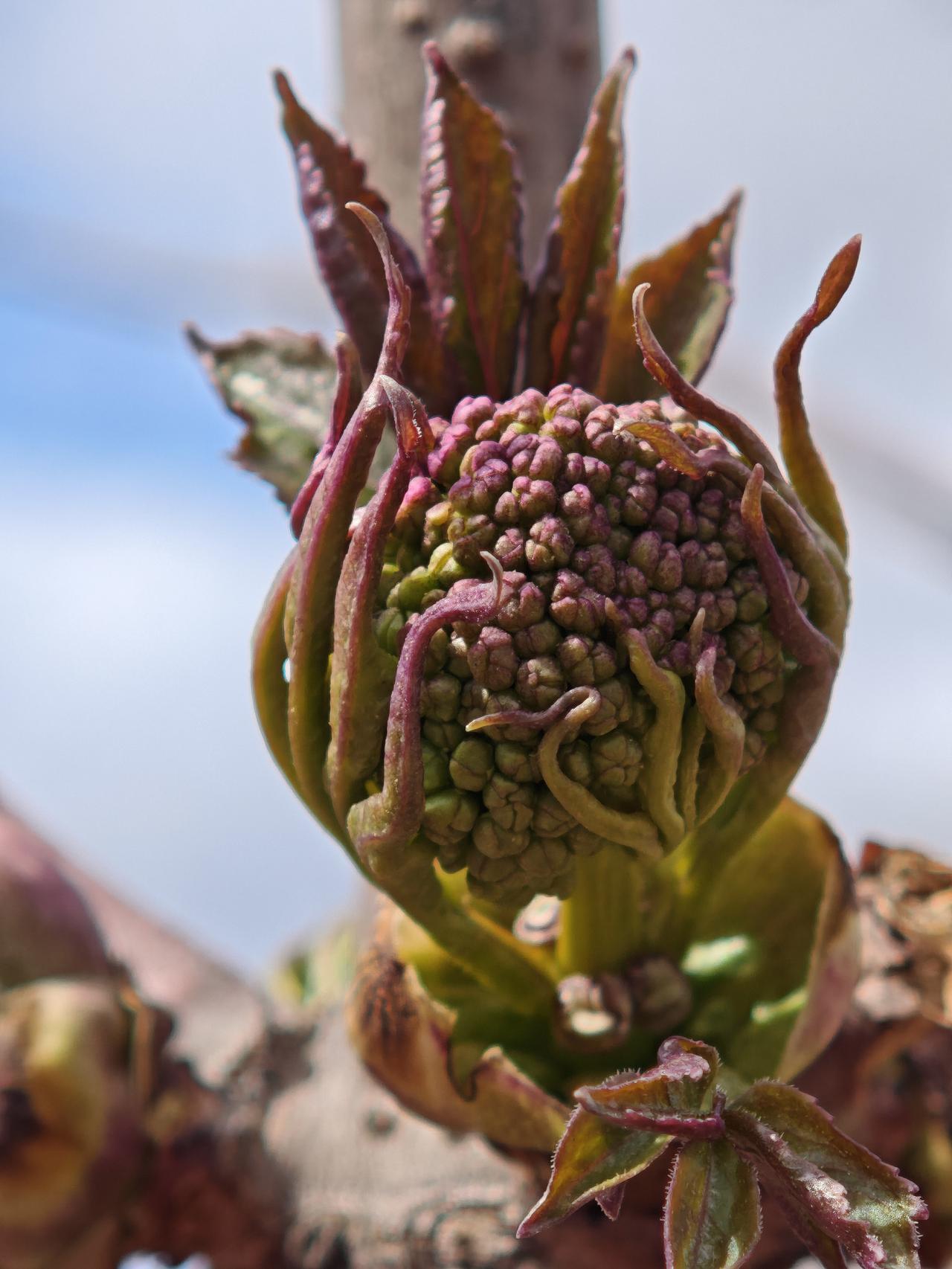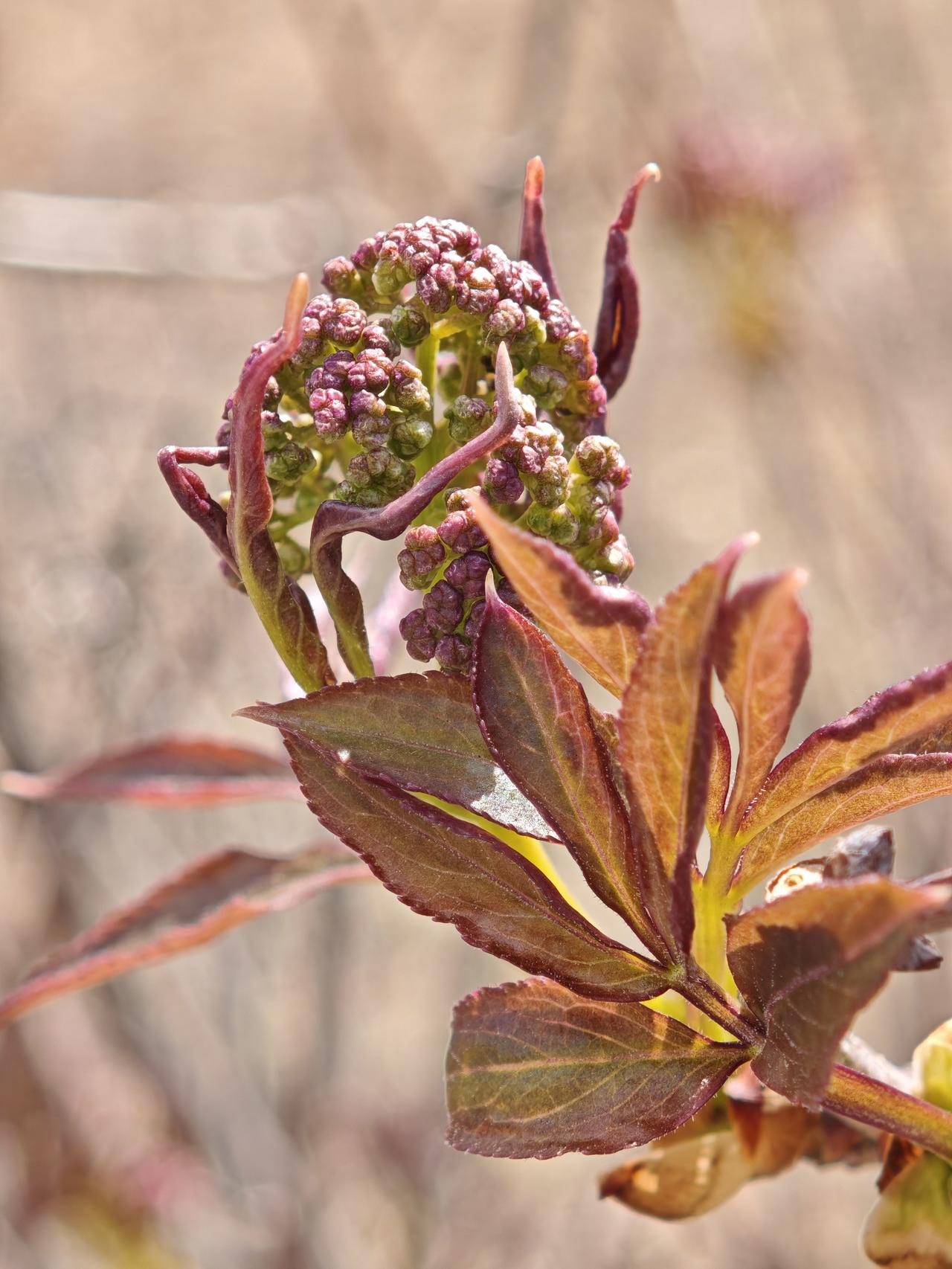 接骨木的花苞,日日都有新的变化。花苞周边的叶子,好似燃烧的火焰,在四周尽情舒展。