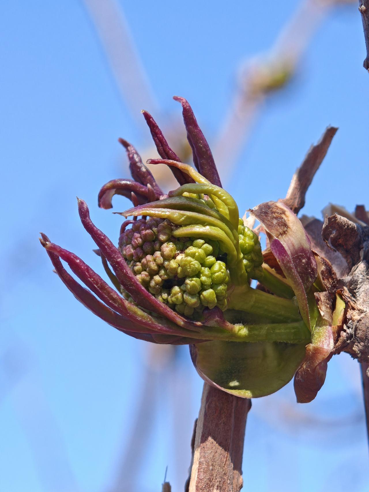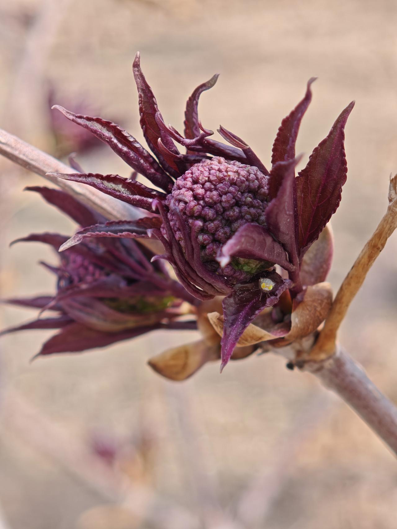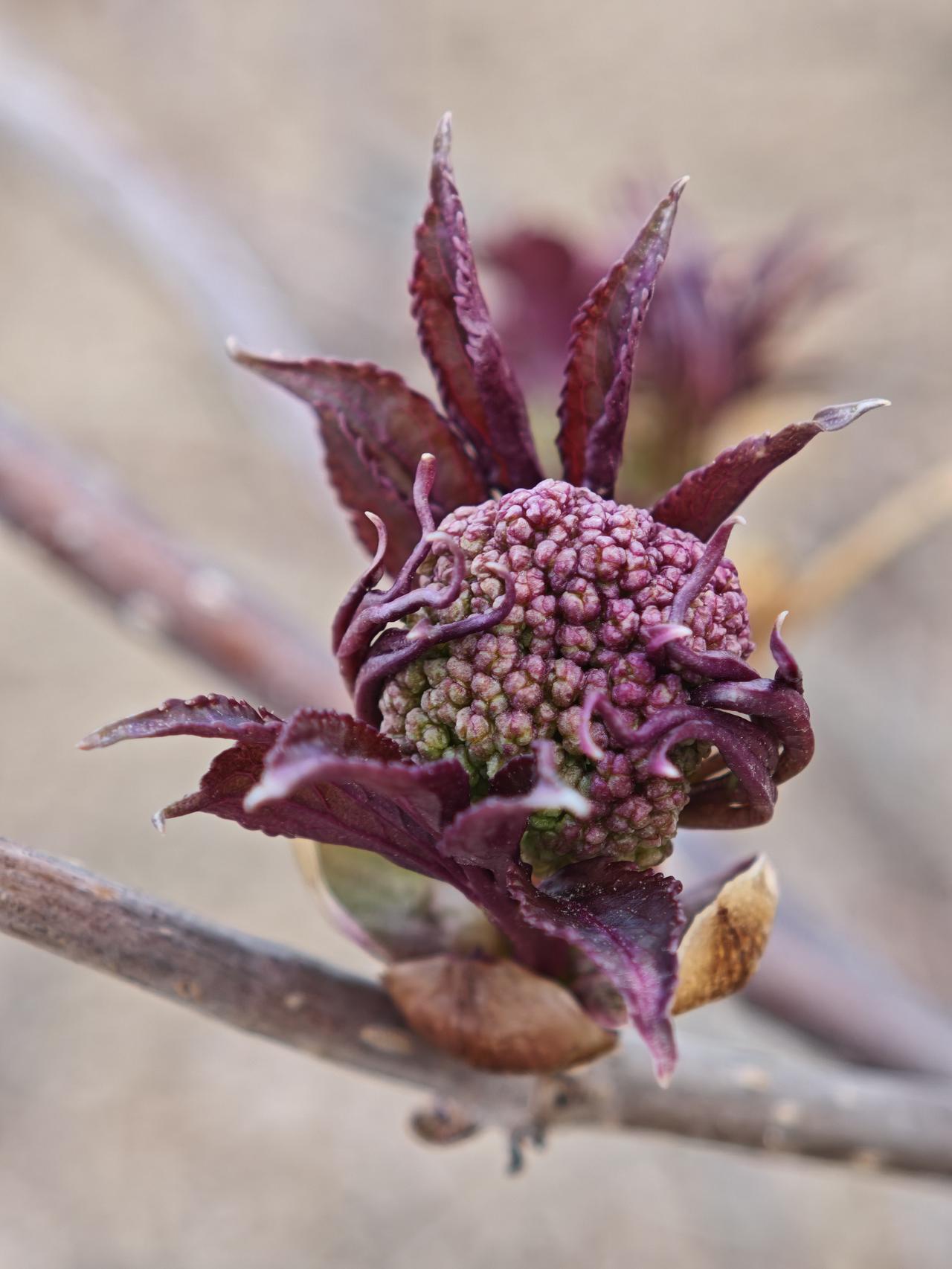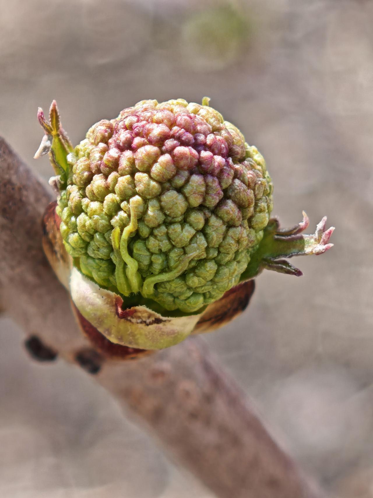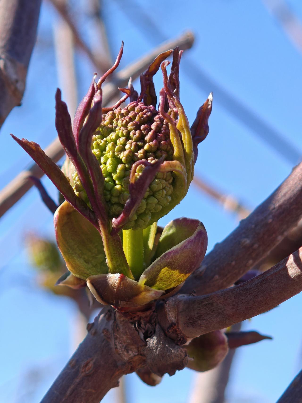 接骨木的花苞,日日都有新的变化。花苞周边的叶子,好似燃烧的火焰,在四周尽情舒展。