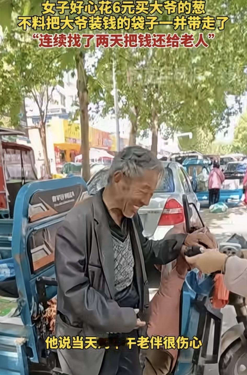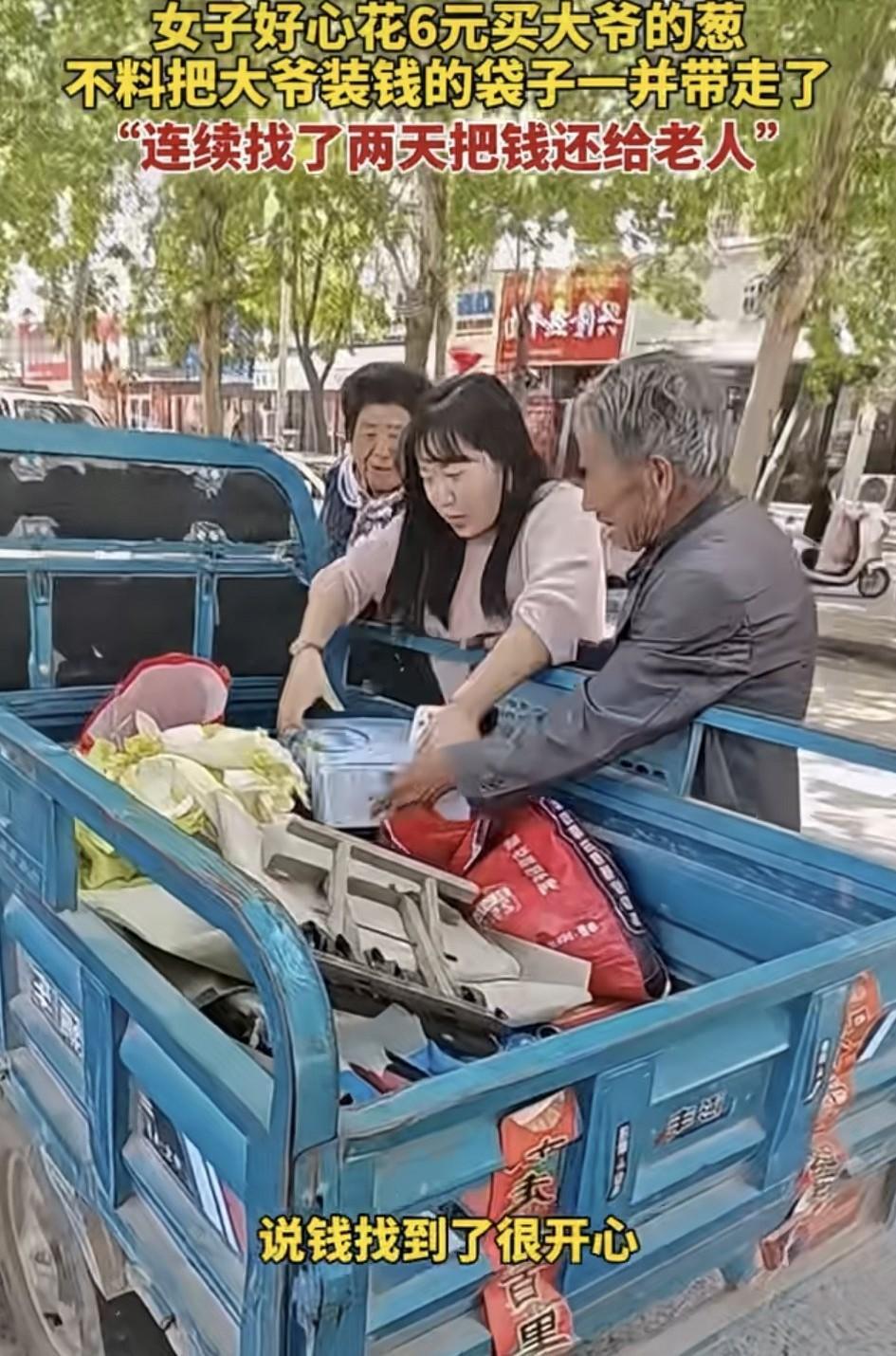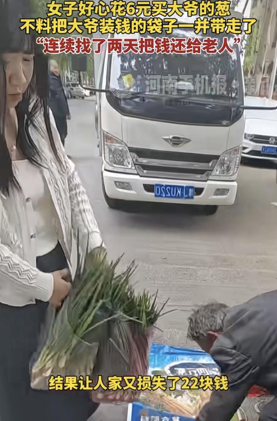好心差点办了坏事。河南濮阳一女子,出于好心花了6块钱,买了一位大爷所有的葱,但却无意中把大爷一上午卖葱的22块一起打包走了。回家发现后的女子满心内疚,之后愣是找了两天才终于找到了老人,并如数归还了老人的买葱钱,还为其送上牛奶和鸡蛋以表歉意。