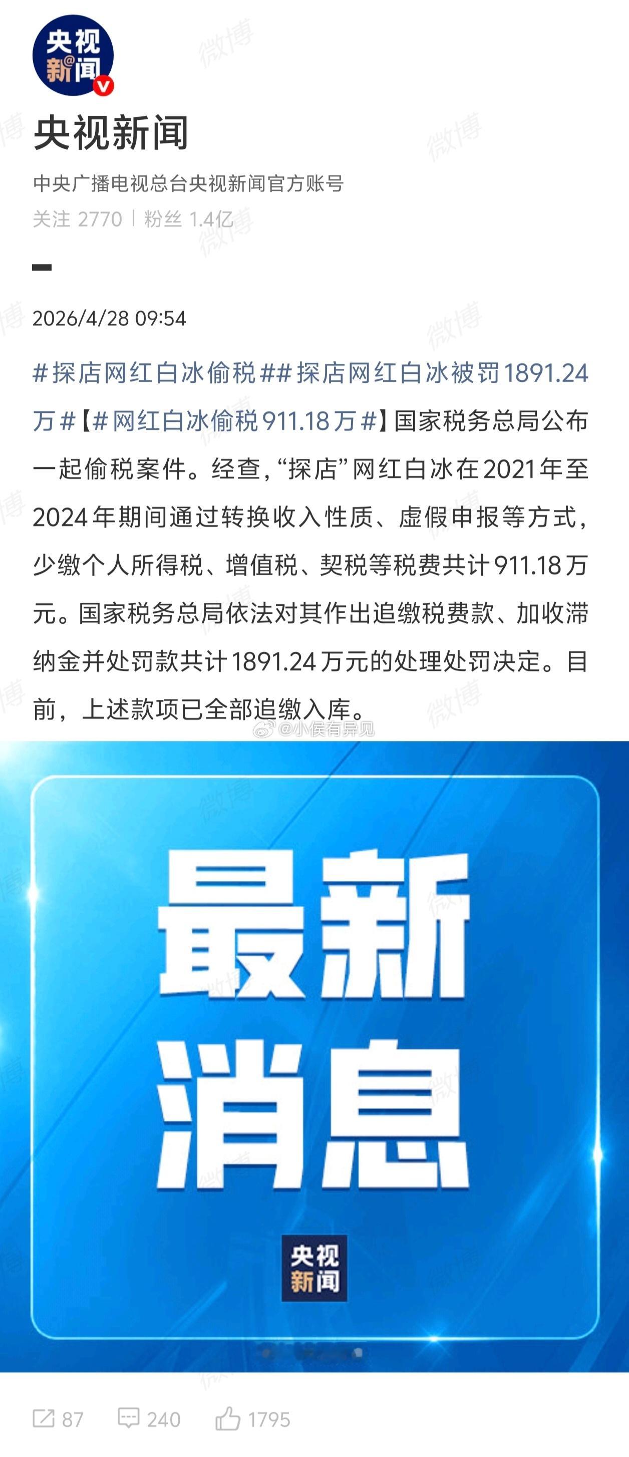 网红白冰偷税911.18万一直搞不懂年收入七八位数的这些网红明星为什么不老老实实缴税,为了这点把前途送走了,得不偿失啊,我要赚这么多钱我每个月自己跑去税务局缴税