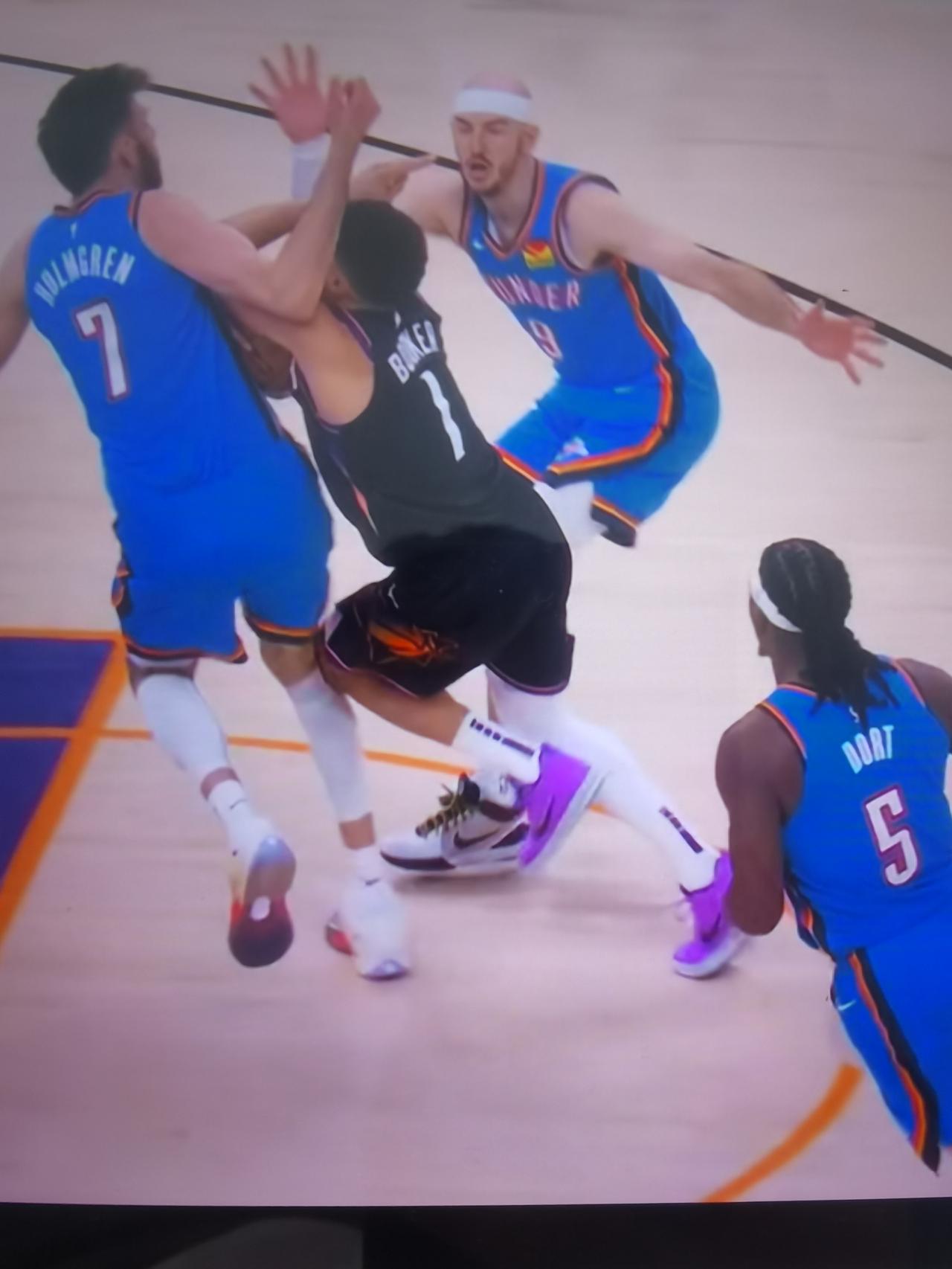 还有人说雷霆的防守比勇士好!这没错,但格林面临的防守没啥变化啊,雷霆的防守资源,大部分集中在了布克身上,首发多尔特紧跟,替补卡森华莱士和卡鲁索接班和补防,看一个回合就知道布克面临的是什么防守?