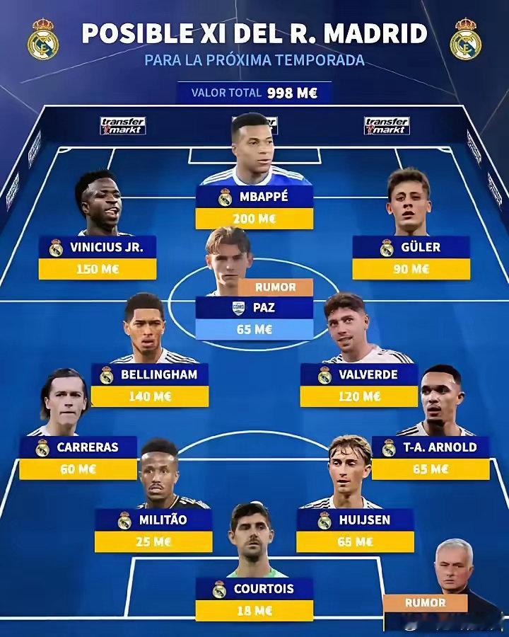 德转大胆预测:穆里尼奥将重返伯纳乌执教,阵容大换血。姆巴佩与维尼修斯搭档锋线,小将居勒尔首发,中场贝林厄姆、巴尔韦德坐镇,尼科·帕斯或被回购重用。后防年轻化,卡雷拉斯、赫伊森与米利唐搭档,阿诺德守右路,库尔图瓦守门。若成真,穆帅防反加前场爆点,画面太美!足球皇马穆里尼奥