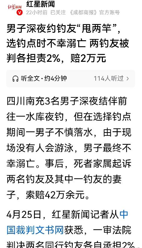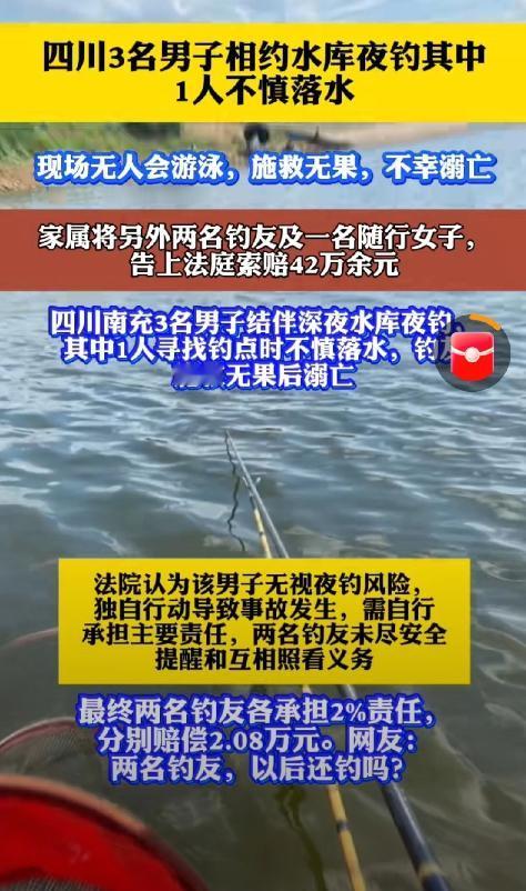 四川南充,4月25日,男子深夜结伴夜钓,钓友寻钓点途中意外落水,同行人全力施救仍无力挽回悲剧,不料逝者家属将同行二人诉至法院,索要四十二万元赔偿,法院判了