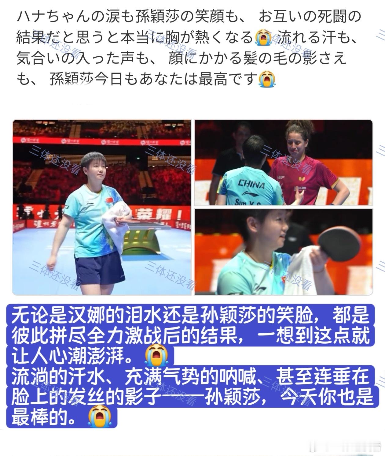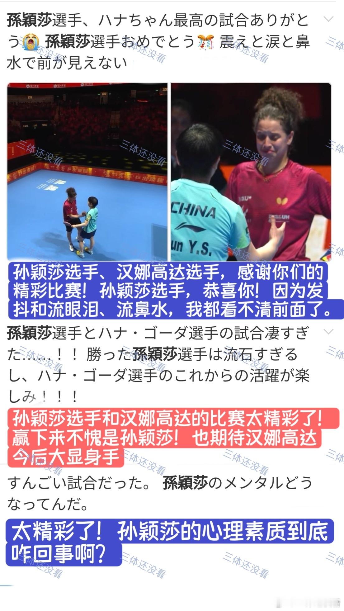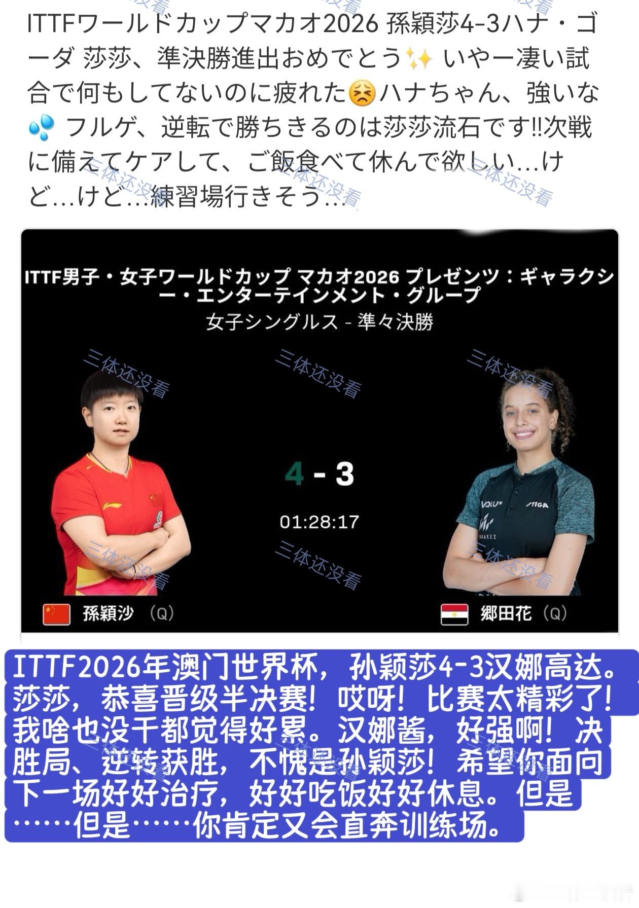 2026年澳门世界杯,1/4决赛孙颖莎vs汉娜·高达的评论分享给大家。“孙酱,我
