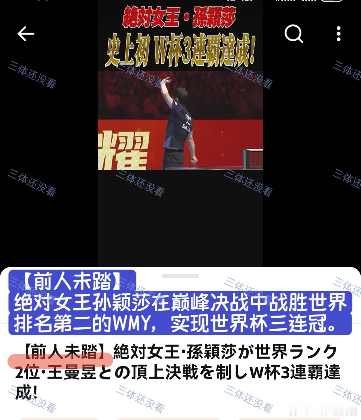 东电小编的用词挺有趣的。仔细看那段世界杯莎莎三连冠的短视频,标题加注【前人未踏】,意为“前人未曾涉足”,前无古人,史无前例。是的,“前人未踏”。孙颖莎孙颖莎创造历史孙颖莎世界杯女单三连冠孙颖莎椰子鸡汤面