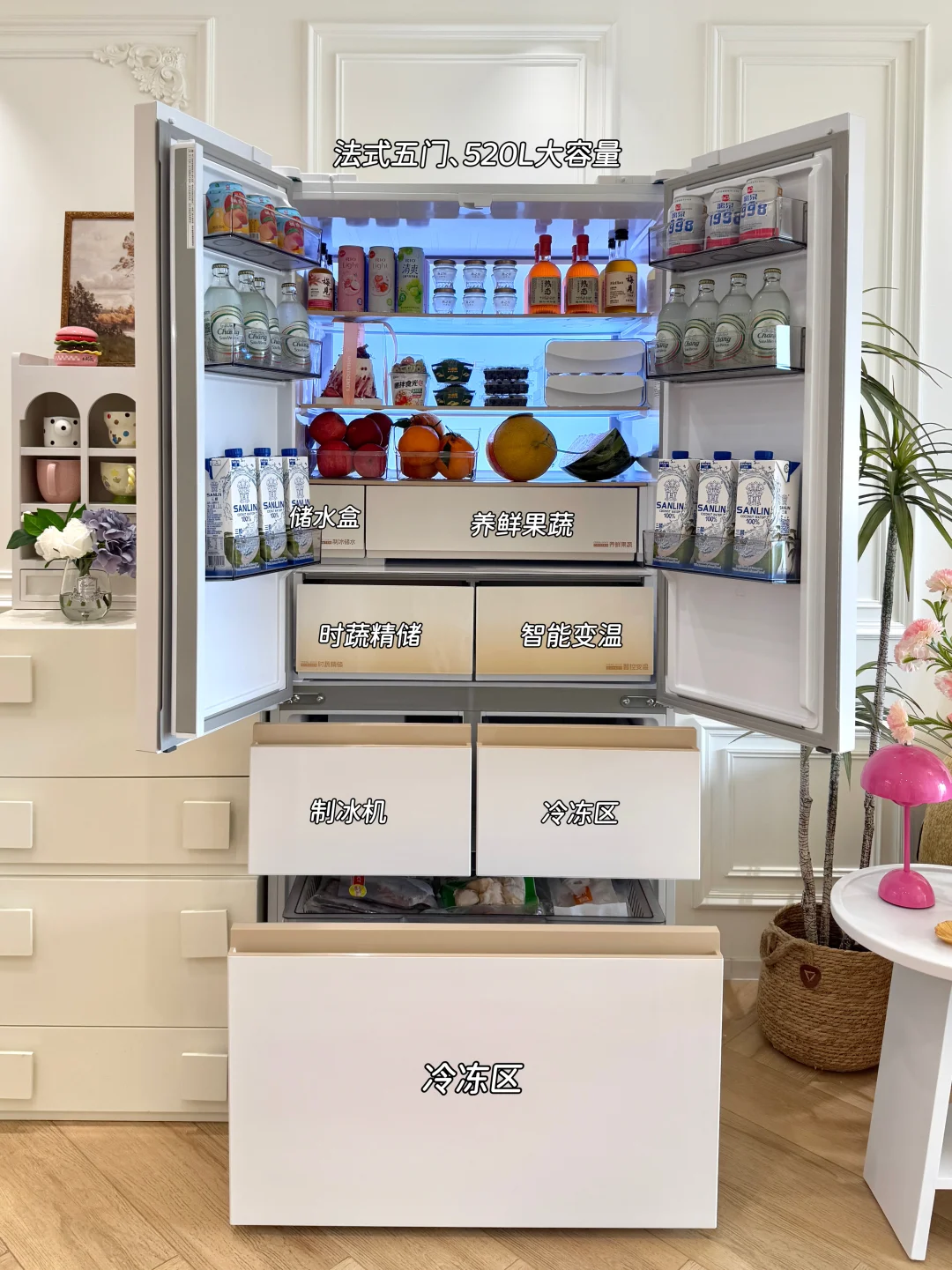 它不仅外观好看,还是法式五门的设计,去趟超市可以把喜欢的食物一次囤个够,各种肉类、蔬菜水果,还有大虾、饮料,塞进520L空间满满当当还绰绰有余~