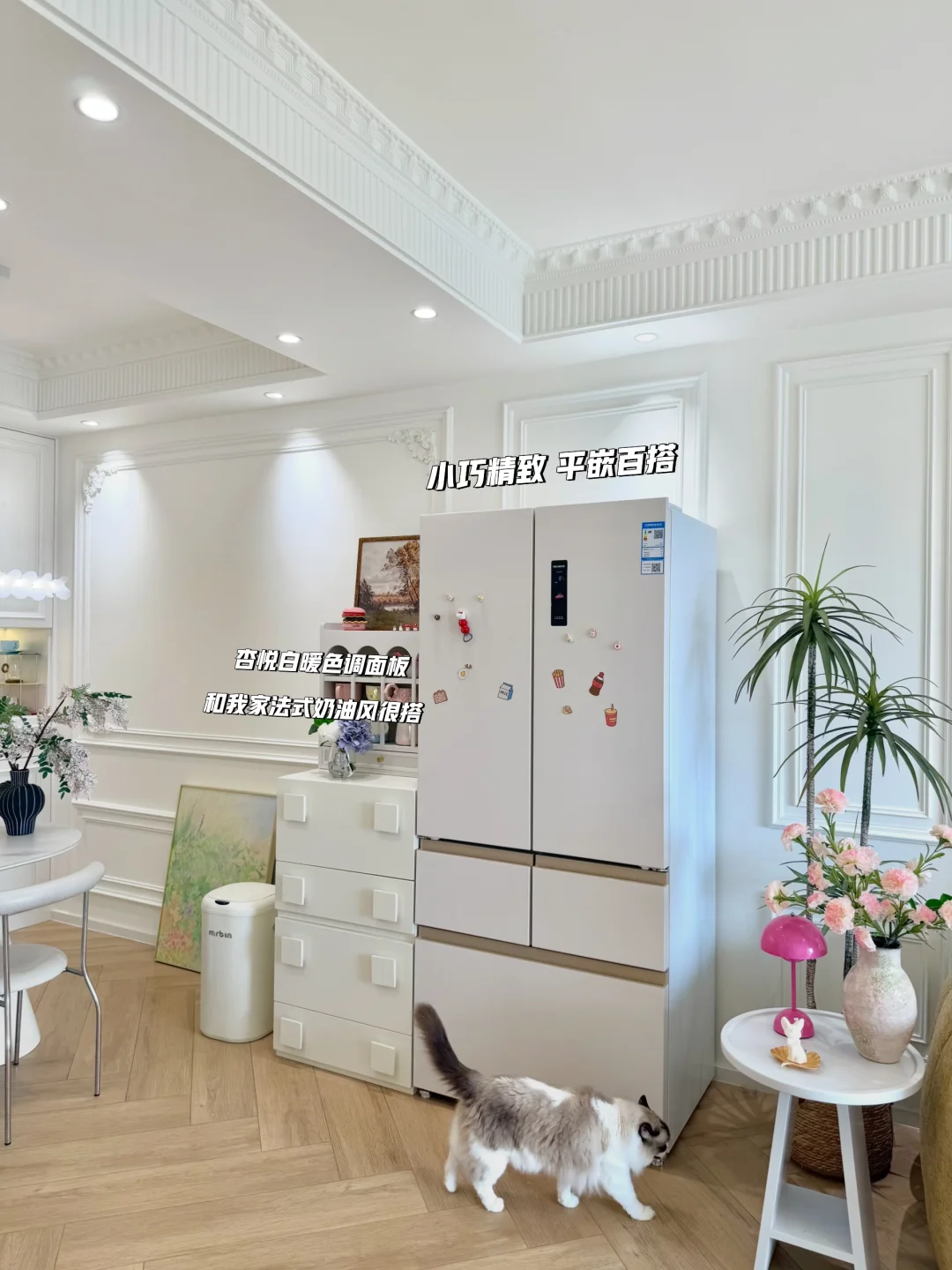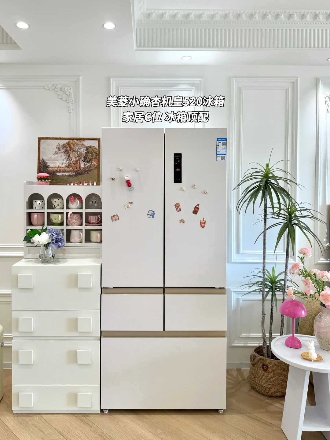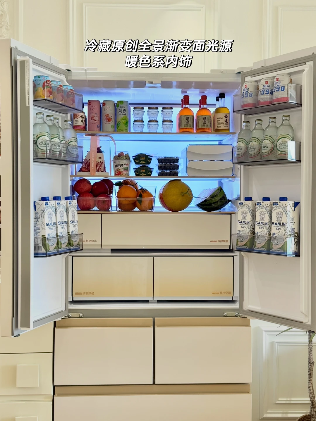 我们做了一个大胆的决定把冰箱放在客厅,我选的是美菱小确杏机皇520冰箱,暖色系外观跟我家装修风格很搭,放在客厅颜值也超高,杏悦白面板配着暖色系内饰,冷藏室是全景原创渐变面光源,柔光渐亮的设计很好看,日常拿取食材也很方便