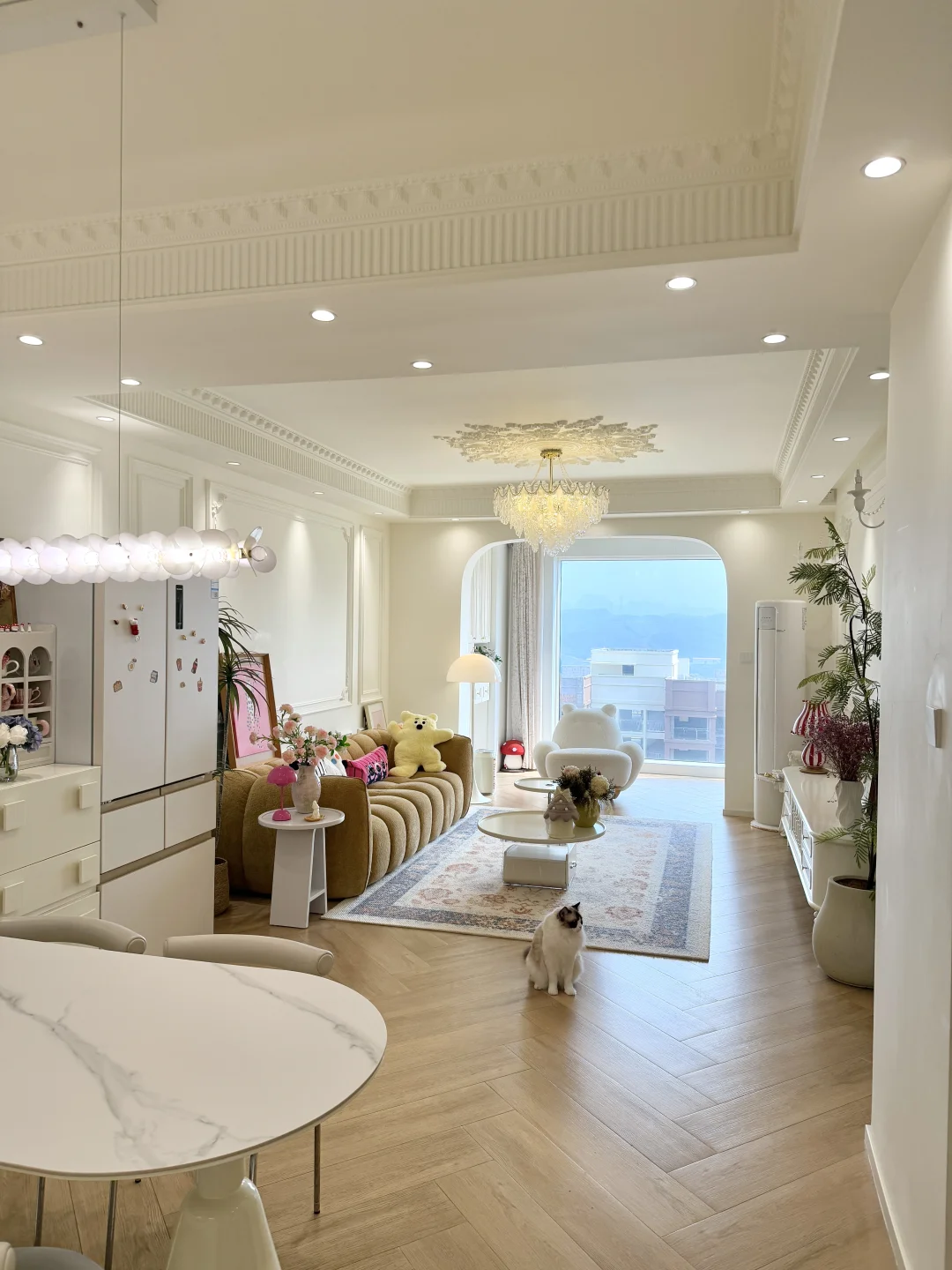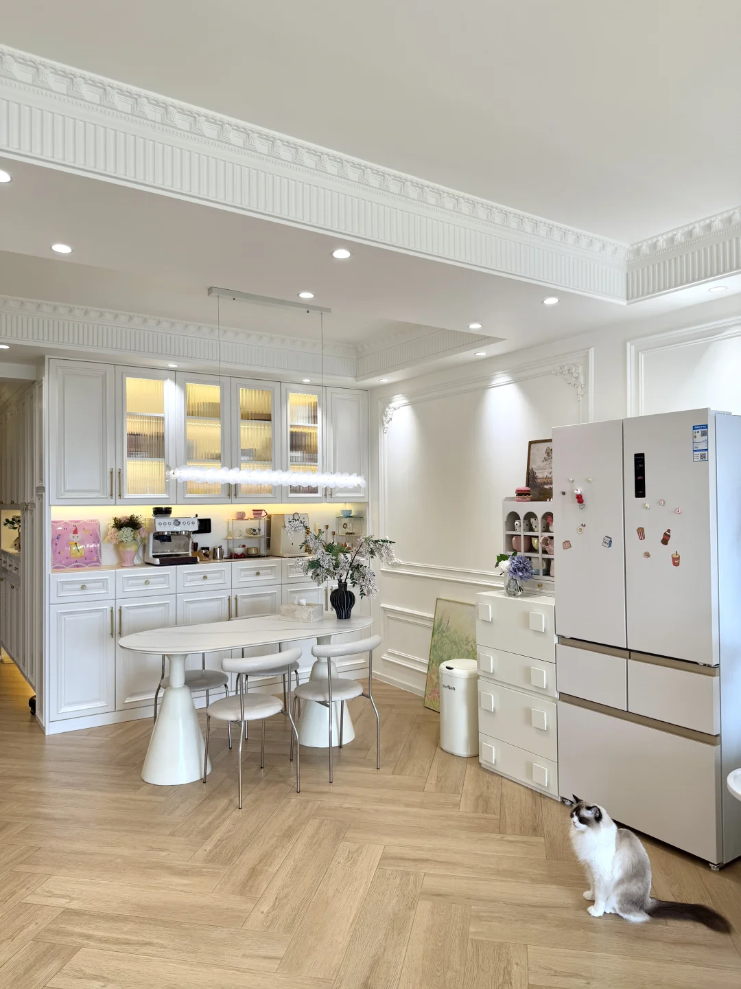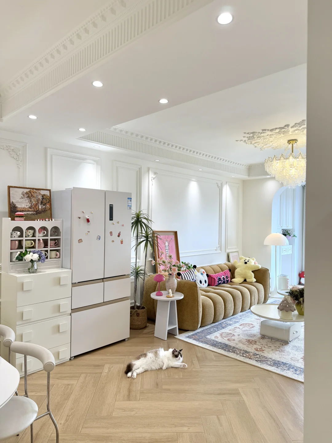 我们做了一个大胆的决定把冰箱放在客厅,我选的是美菱小确杏机皇520冰箱,暖色系外观跟我家装修风格很搭,放在客厅颜值也超高,杏悦白面板配着暖色系内饰,冷藏室是全景原创渐变面光源,柔光渐亮的设计很好看,日常拿取食材也很方便