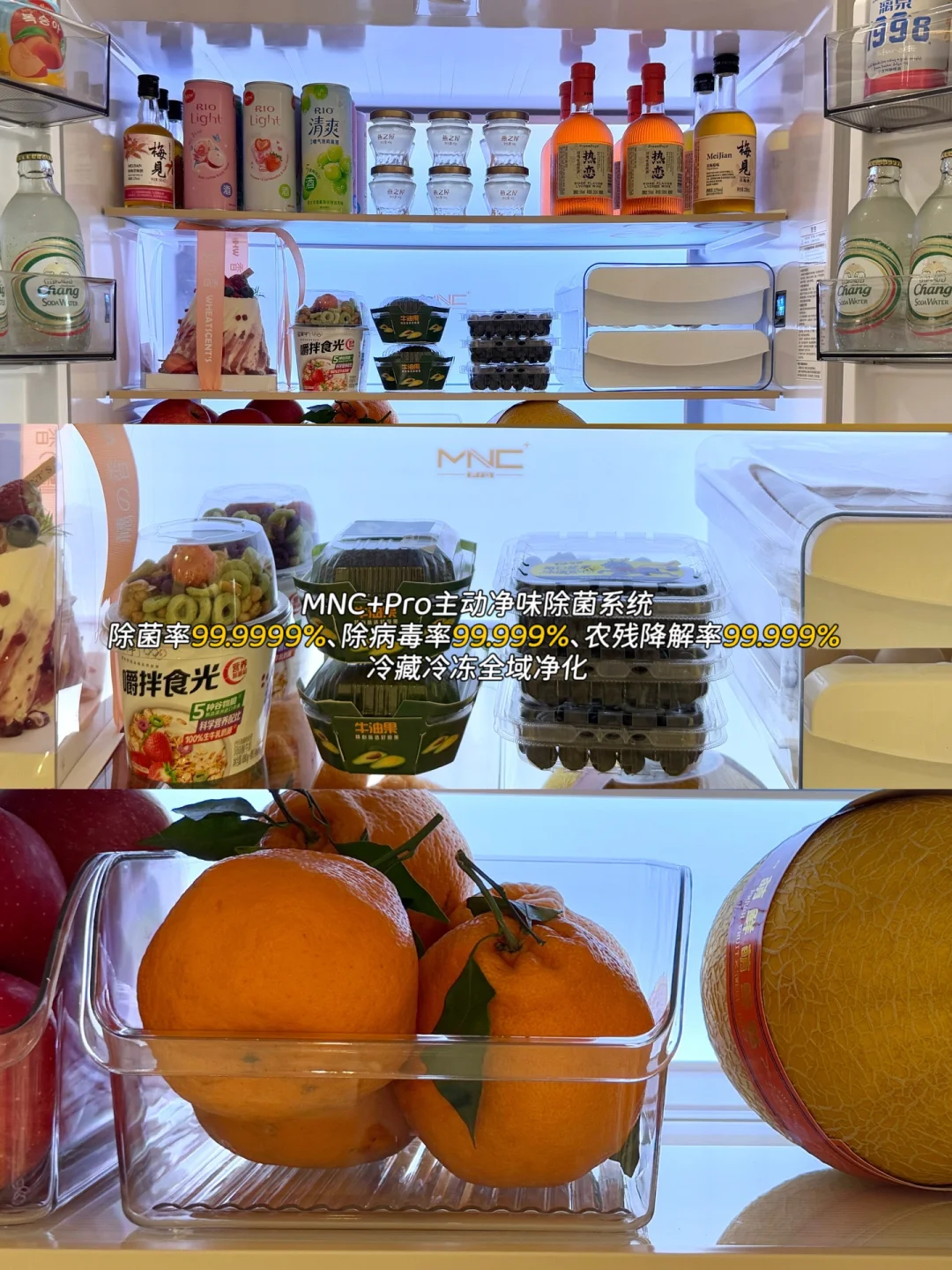 我选冰箱最担心的还是怕食物串味,所以选它也是看中它是双蒸发器系统,各种食物放进去也不怕串味,内部有MNC+Pro主动净味除菌系统,主动除菌率99.9999%,可以实现冷藏冷冻全域净化,买的食材放了几天也依旧新鲜,就算好几天不出门也能让家人吃上新鲜蔬菜水果了🍉