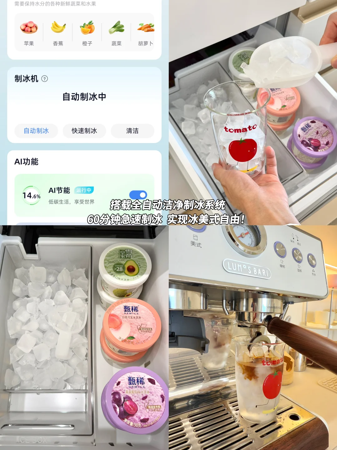 当然打工人怎么能少了冰美式呢,这台冰箱还搭载了全自动洁净制冰功能,60分钟急速制冰,从此实现冰美式自由!🧊
