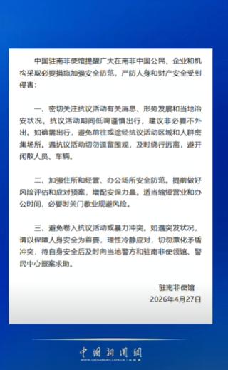 中国驻南非使馆4月27号正式发布提醒,专门针对在南非的中国公民、各类企业和机构,反复叮嘱大家近期一定要绷紧安全弦,重点防范当地的游行、示威等抗议活动带来的风险。