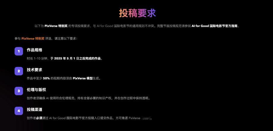 一定要去联合国AI for Good电影节官网提交作品,在工具一栏填写PixVerse,这样你才能自动进入 PixVerse 特别奖的评选池。