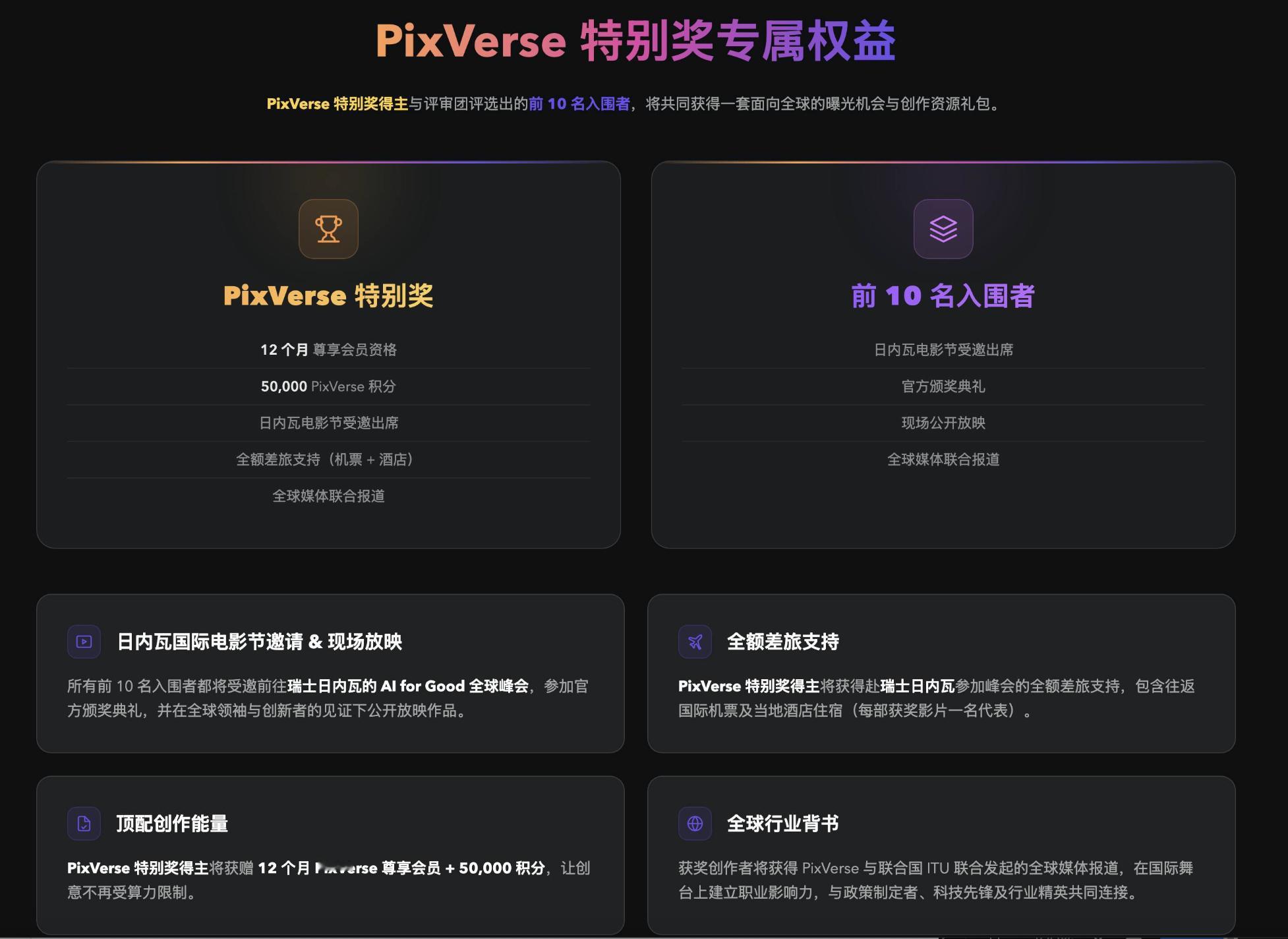PixVerse特别奖,提供额外专属奖励:12个月尊享会员、50,000积分、与国际电信联盟的联合媒体曝光,以及优先进入PixVerse创作者合作计划的资格。