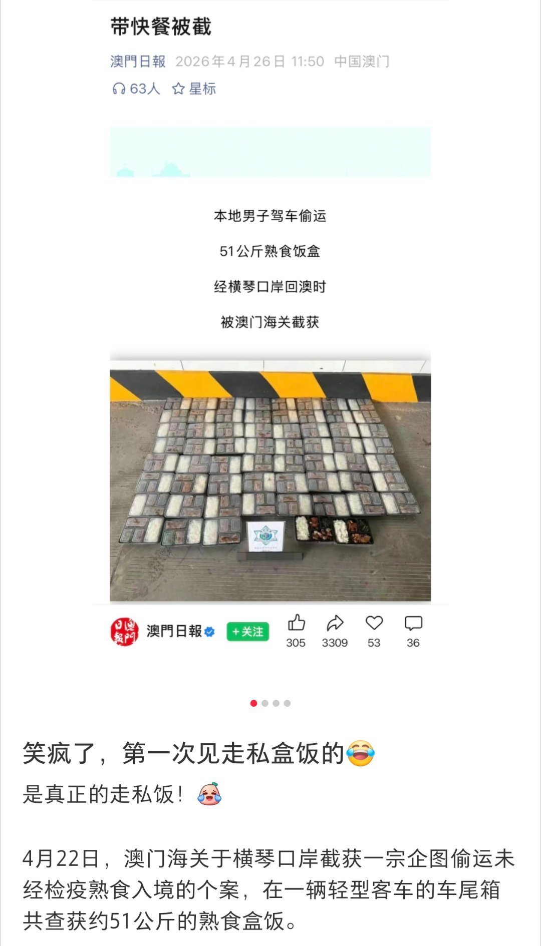 4月22日澳门海关在横琴口岸查获的这起走私盒饭案太让人意外了。涉案的35岁澳门男