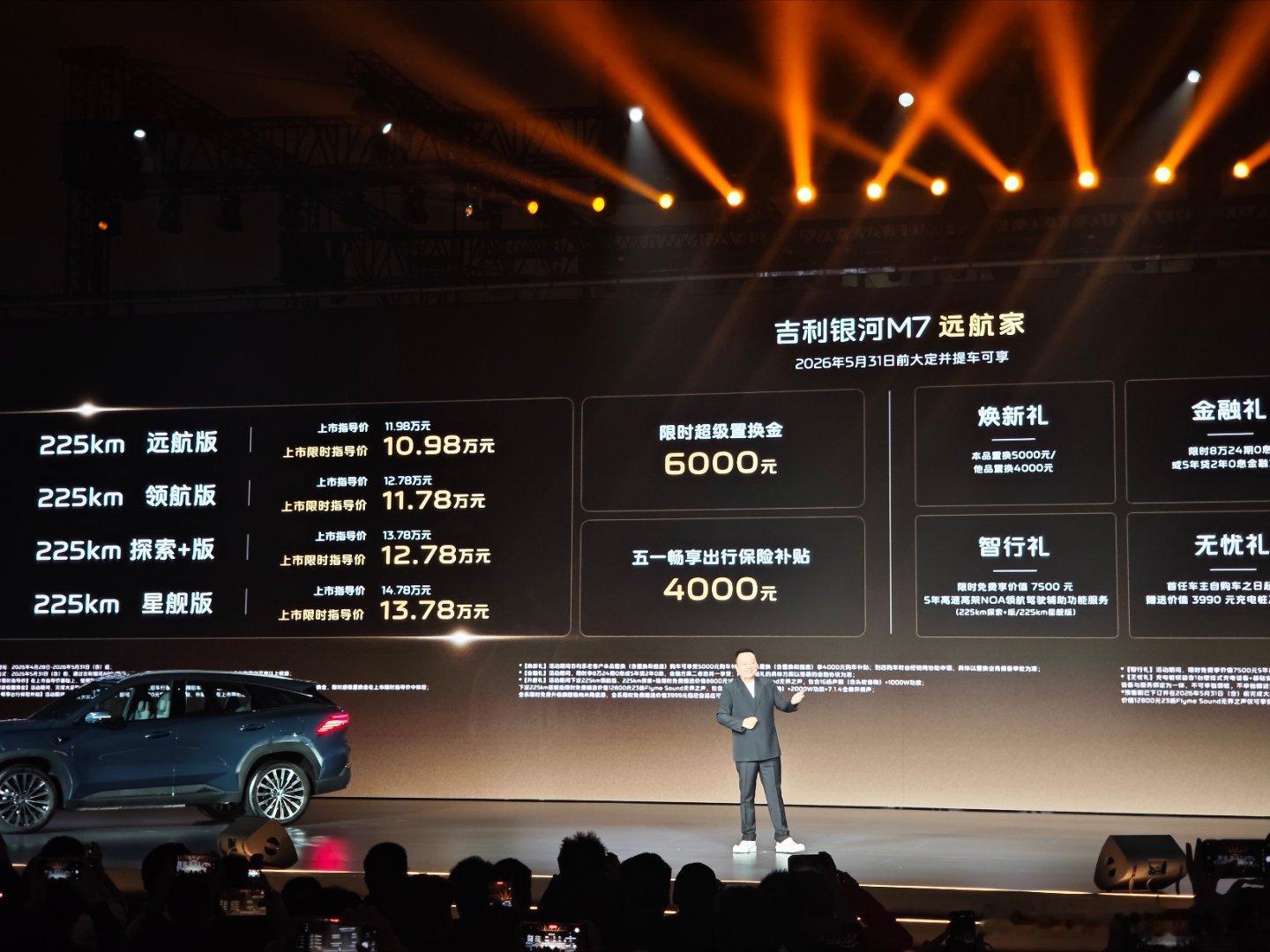 吉利银河M7既然这仗打乱了,咱们就乱着打。吉利银河把混动纯电续航拉到了200km+尺寸:4770×1905×1685价格发布:远航版10.98万元→225KM纯电续航纳米陶瓷漆、阻尼自适应可变悬架领航版11.78万元→flyme sound 16扬探索+版12.78万元→千里浩瀚H3辅助驾驶方案、水晶旋钮星舰版13.78万元→flyme sound 23扬、20英寸轮毂、座椅舒适配置吉利银河M7远航家10.98万起吉利银河M7远航家上市