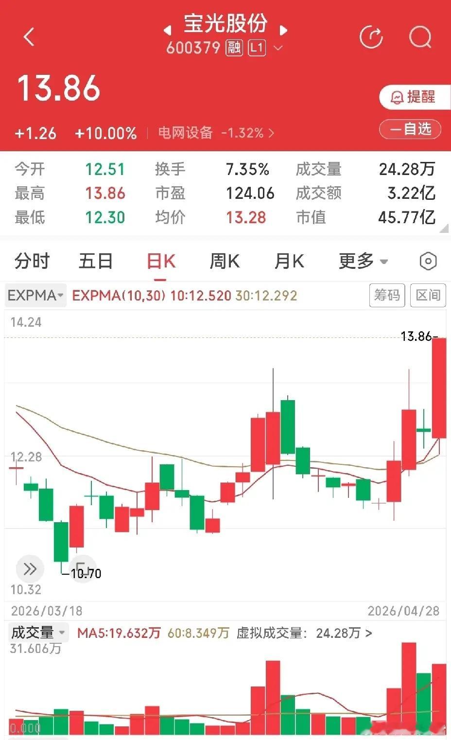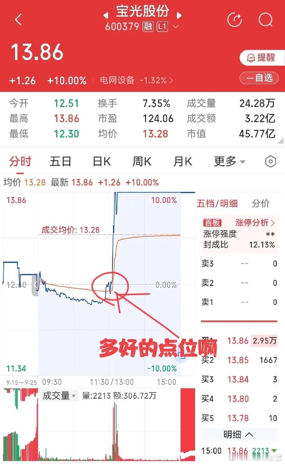 今天错过了一些机会,实在可惜。主要是盯盘方向错了,看好的自选股,没跟上,有点说不过去。日海智能,昨天选出来,今早开盘开得高,冲得也快,没跟上,可以原谅。宝光股份,昨天还跟我朋友说,今天要盯此股,是个短期较佳品种。今天早上看了一眼,没动静,就放在一边了。平常,中午我会稍微翻看一下自选股,看看每一位都是什么状态,今天中午大意了、懒惰了,没浏览。如果稍微用点心,看到宝光股份这种分时走势,我是不会放过他的,因为是我喜欢的分时图。说什么都晚了,只有拍大腿,都别拦着我,自己把大腿拍肿,以解此憾。