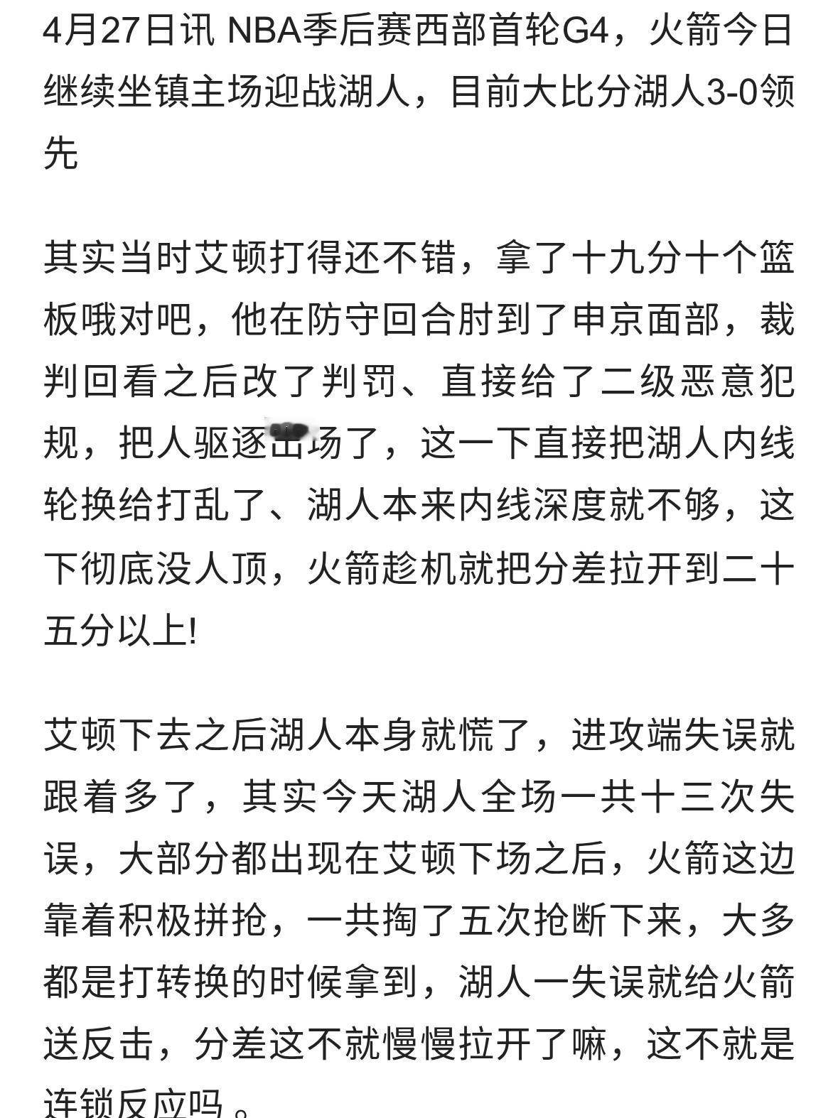🏀火箭大胜湖人拒横扫阿门23+7老詹9中2&8失误艾顿19+10遭逐
