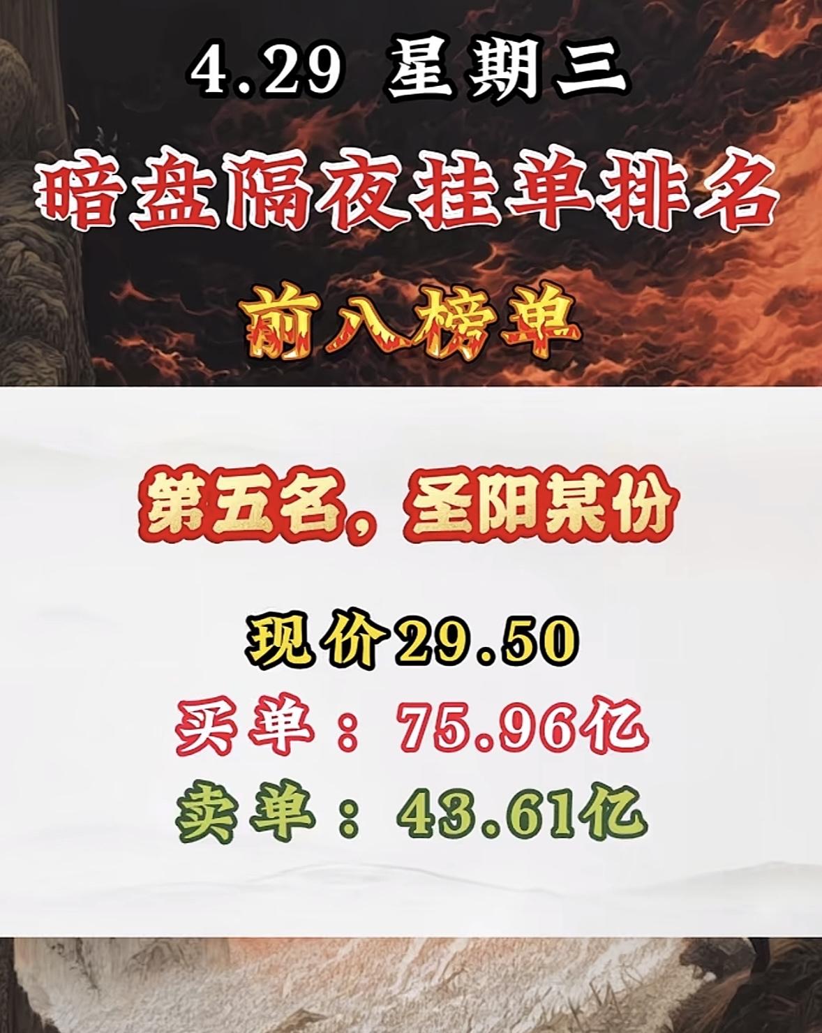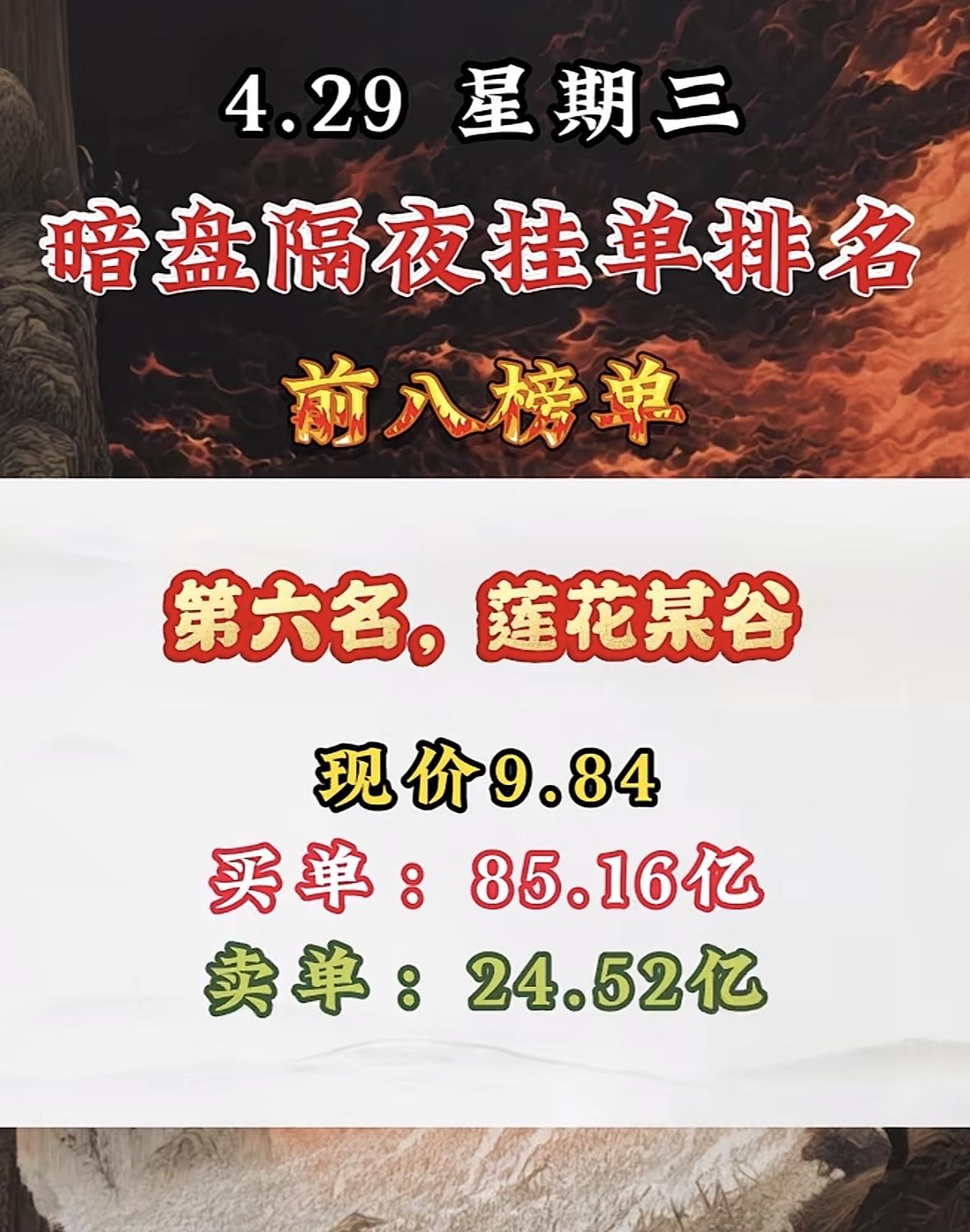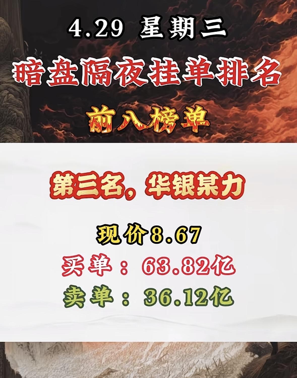 4月29日周三暗盘隔夜挂单排行榜揭晓