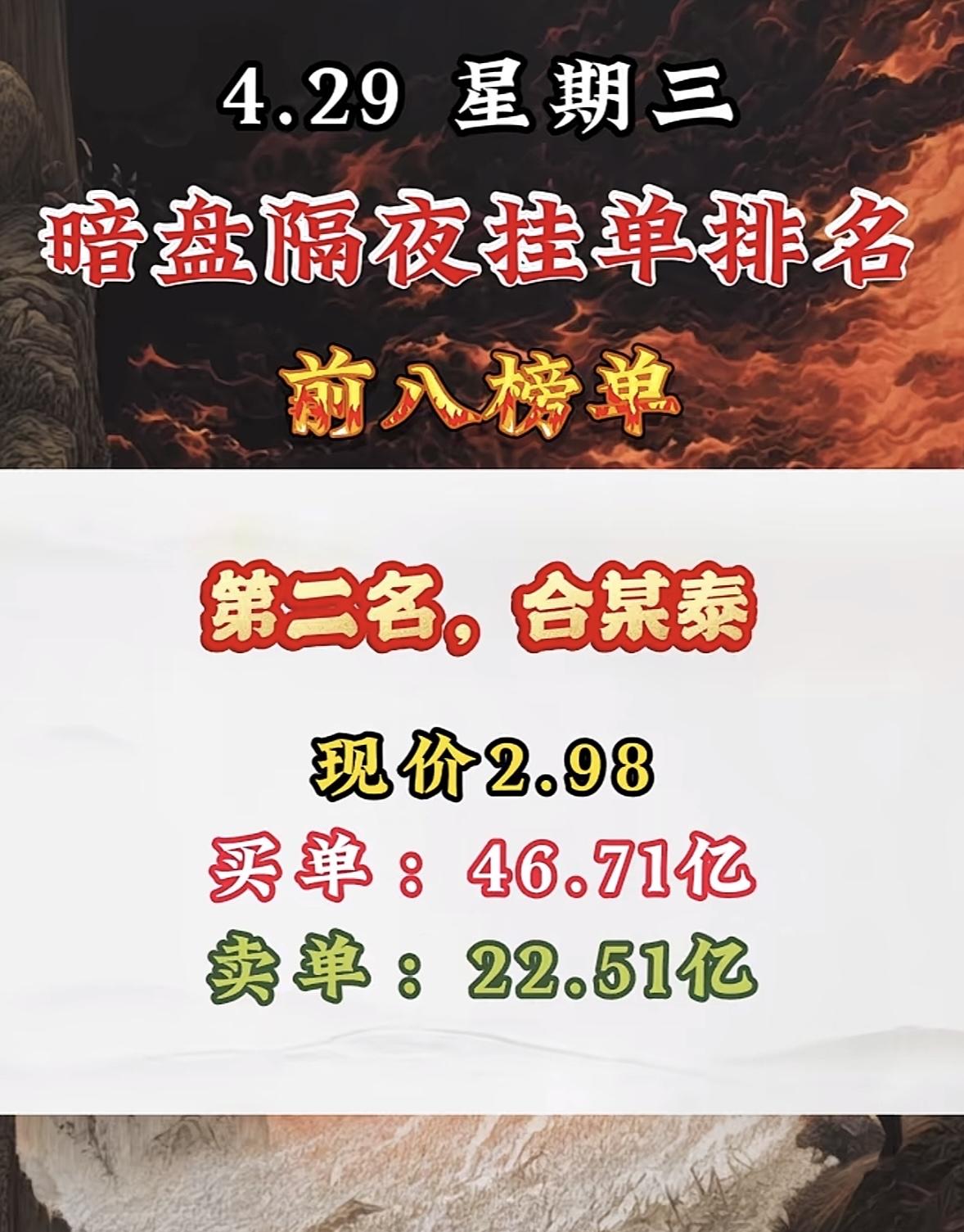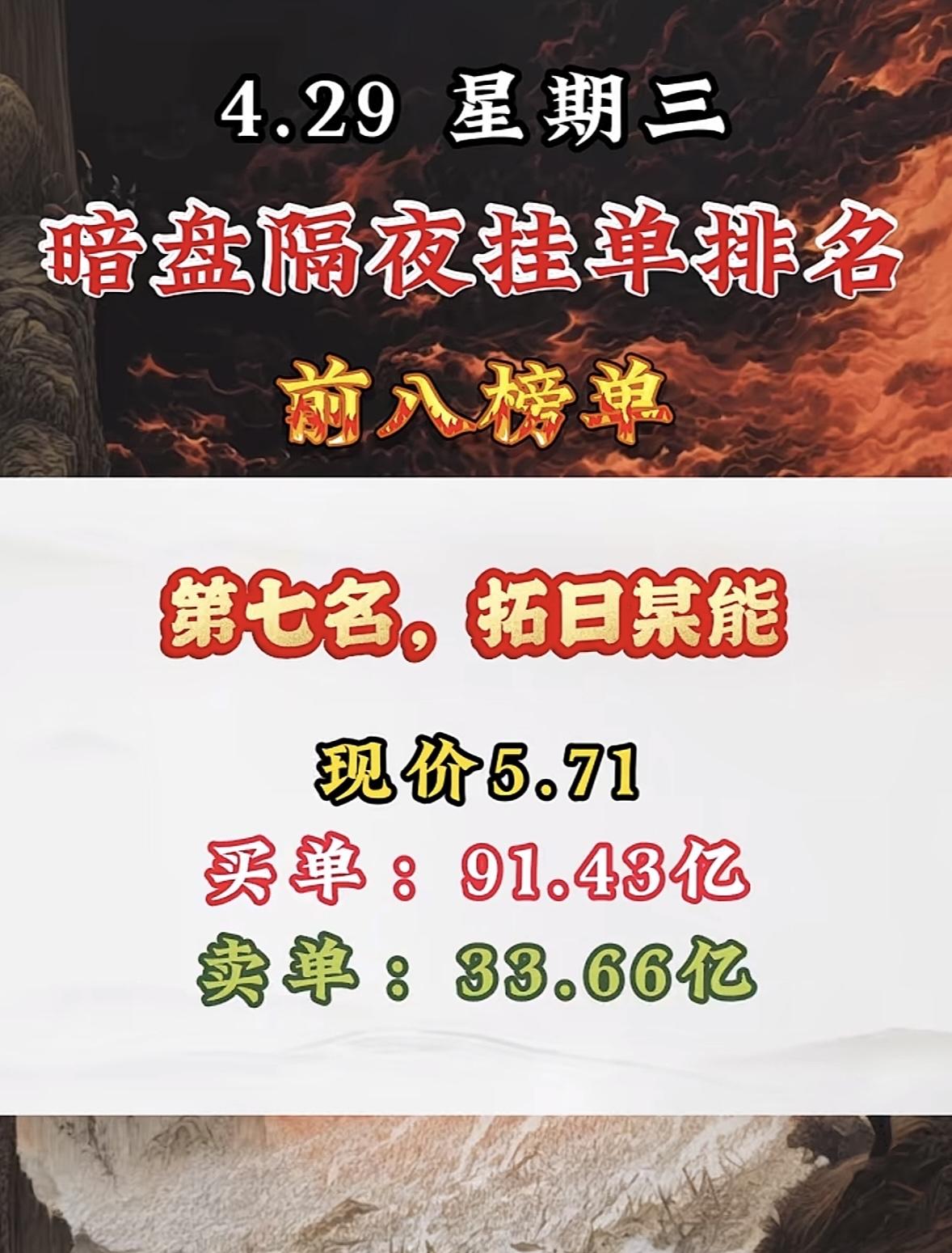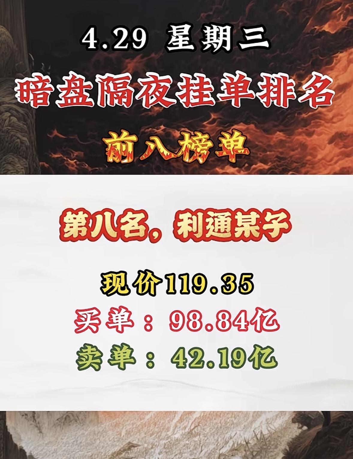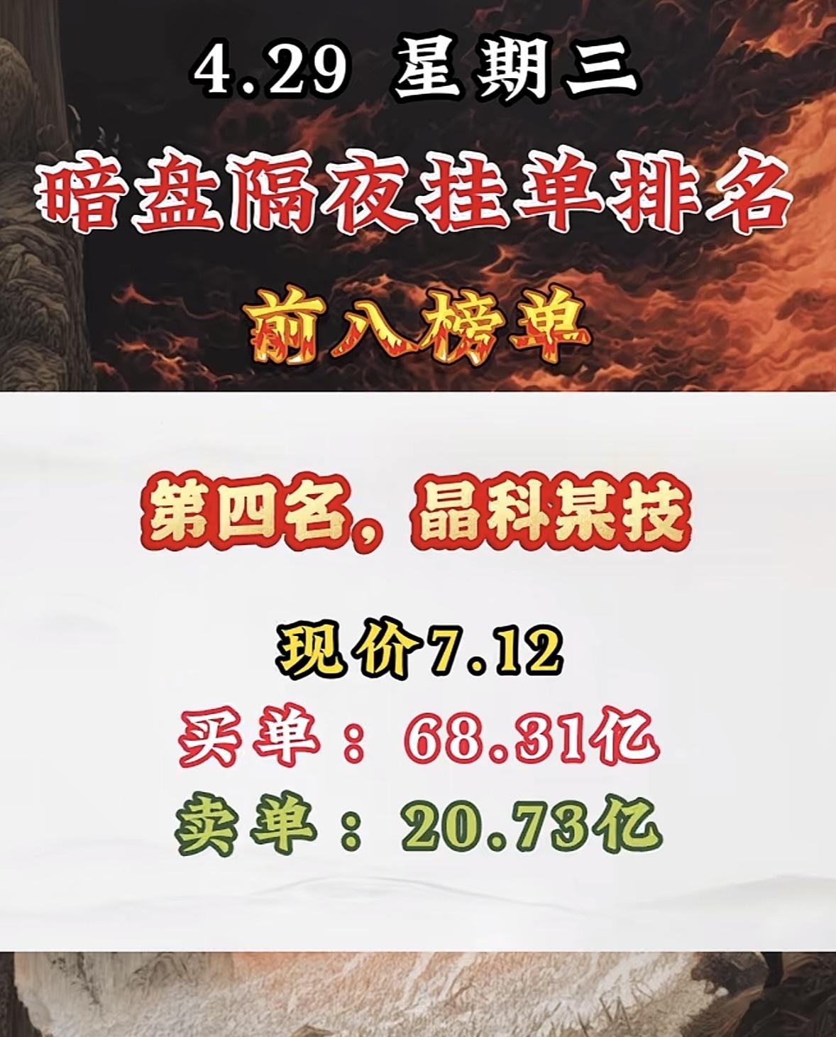 4月29日周三暗盘隔夜挂单排行榜揭晓