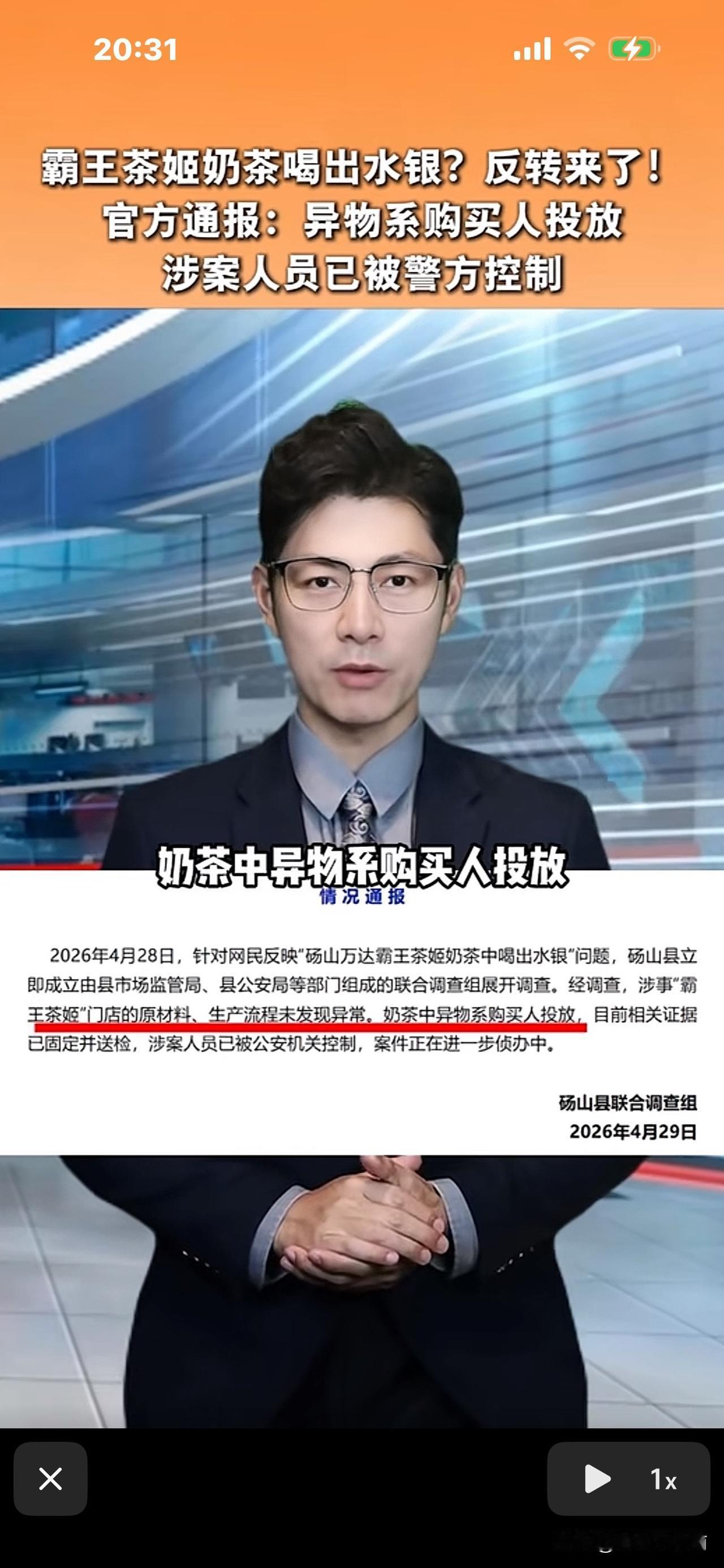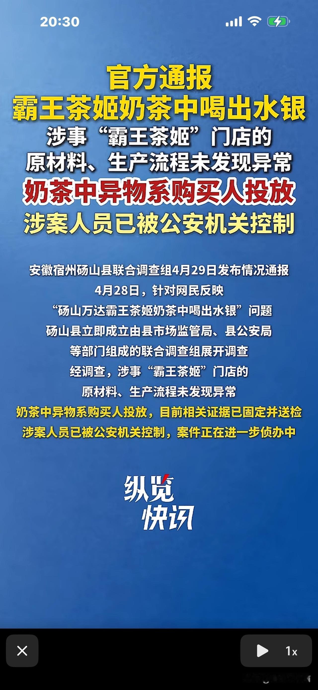4月28日,当地市场监管局、县公安局等部门组成的联合调查组展开调查。4月29日,调查结果显示,该“霸王茶姬”门店的原材料、生产流程未见异常。水银是买奶茶的女顾客自己购买投放的。