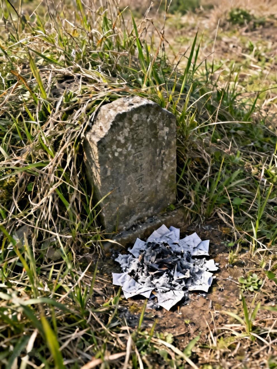 游走在山乡见到上坟的烧纸人 荒草萋萋隐旧坟, 草纸灰烬化为尘。 今日荒野长眠客