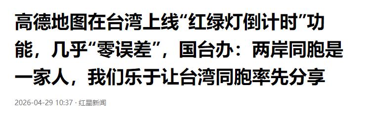 4月29日,国务院台办例行新闻发布会上,有记者专门:近期高德地图App在台湾上线“红绿灯倒计时”功能,导航显示的倒计时时间几乎没误差,特别便利高效,台湾不少民众都在社交平台点赞推荐。