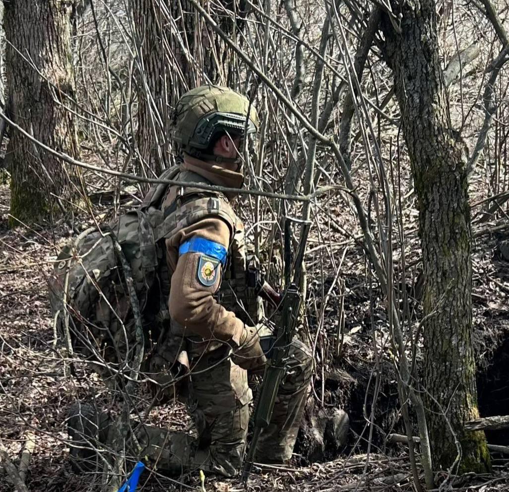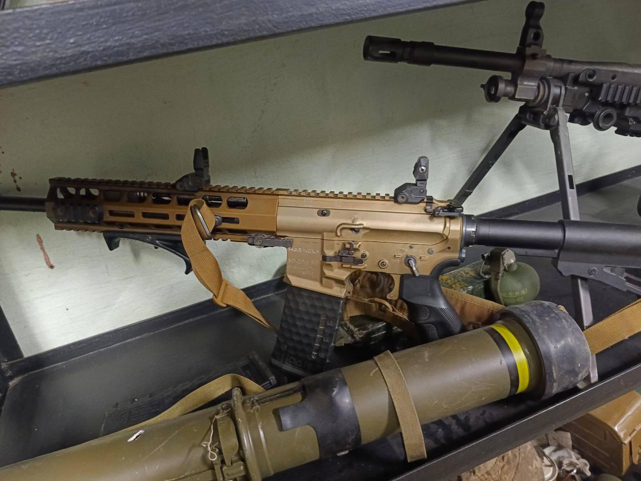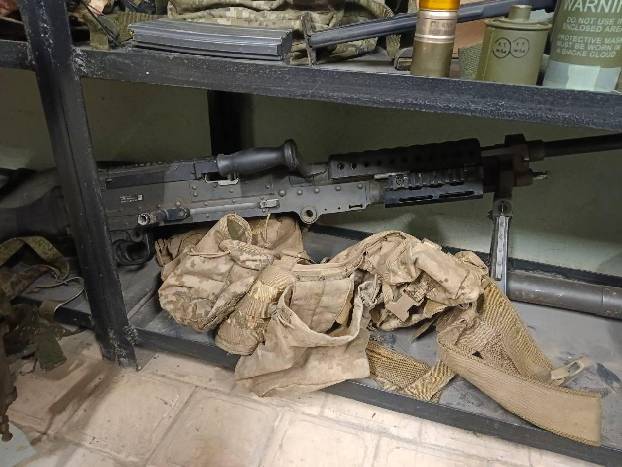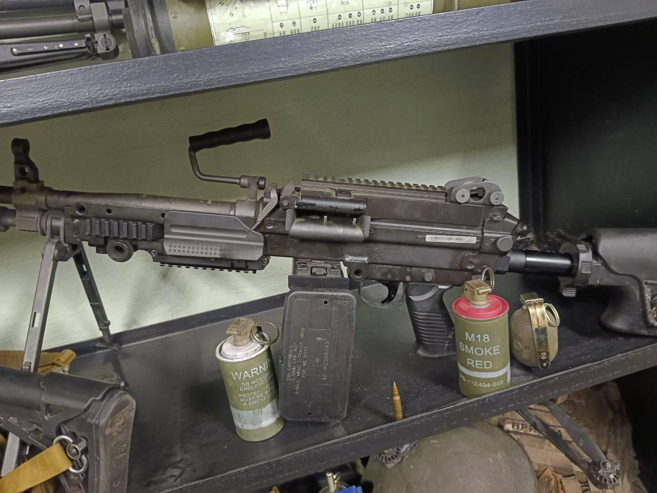 照片中,这名士兵身穿森林迷彩服,佩戴乌克兰蓝色臂章和部队臂章,其它图片是一排排缴获的装备,包括机枪、棕褐色AR式步枪、手榴弹和烟雾弹。
