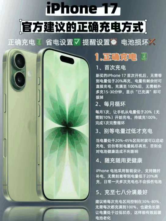 很多人还停留在功能机时代的老观念,觉得新手机必须先把剩余电量耗光,再连续充满十几个小时激活电池,这套操作放在现在的 iPhone17 上,完全是多余的伤机行为。刚拆封的新机,哪怕开机还有一半的电量,也可以直接插上充电器,完全没必要硬等到电量见底;充到系统提示已充满,就可以直接拔线,所谓的多充十几分钟补电,没有任何实际意义,反而会给电池增加不必要的压力;哪怕一天充个三四次也完全没问题,iPhone 的智能电池管理,完全适配随充随用的使用习惯,根本不会损伤电池寿命。